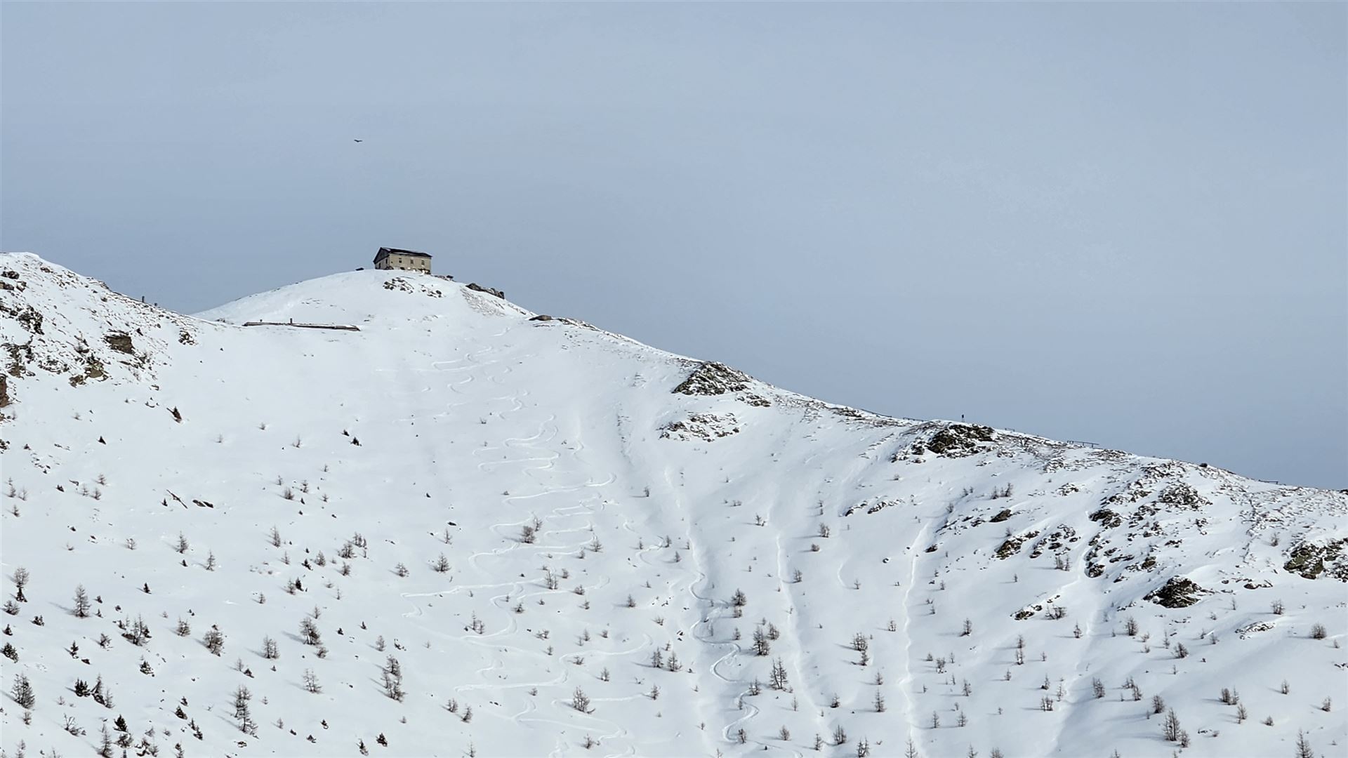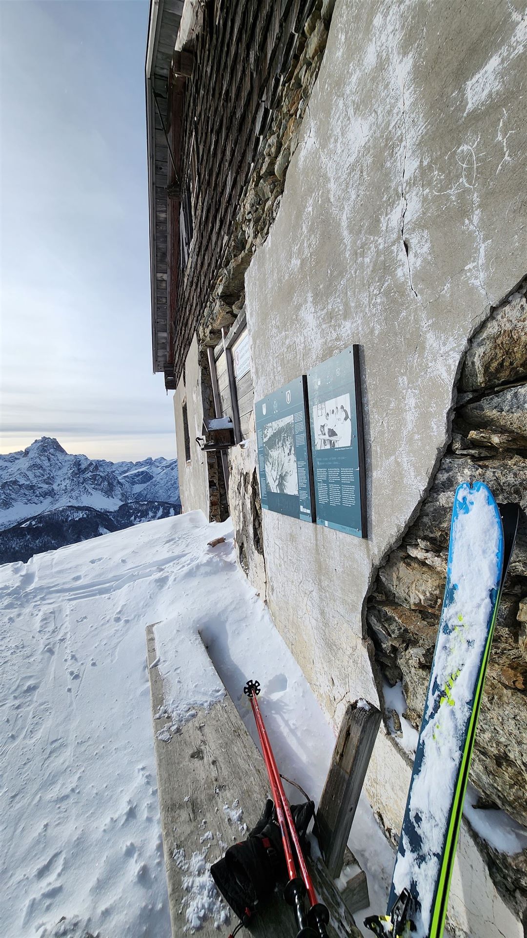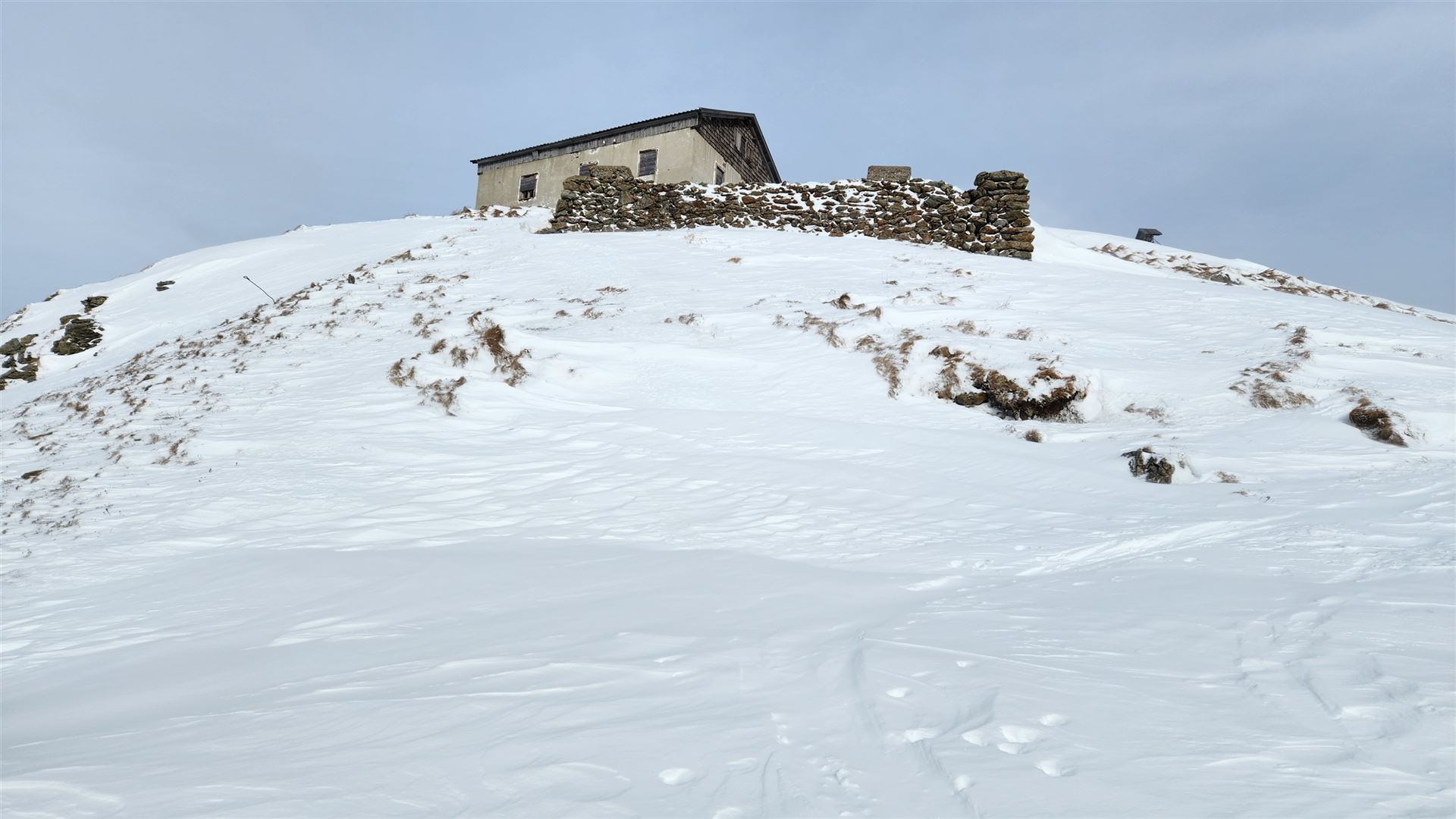 Die Helmhütte auf dem Gipfel, eine verfallene Grenzhütte auf 2434 m, war verschlossen. Ich suchte Schutz im Windschatten des Gebäudes und wechselte die Kleidung für die Abfahrt. Für die Panoramatafeln hatte ich keine Muße. Dafür war es zu kalt und zu windig. Mein Plan war, aus Sicherheitsgründen, den gleichen Weg zurück zum Ziehweg abzusteigen, um ins Skigebiet zu gelangen. Das wäre schwierig genug gewesen, abwärts ist es bekanntlich schwieriger als bergauf.