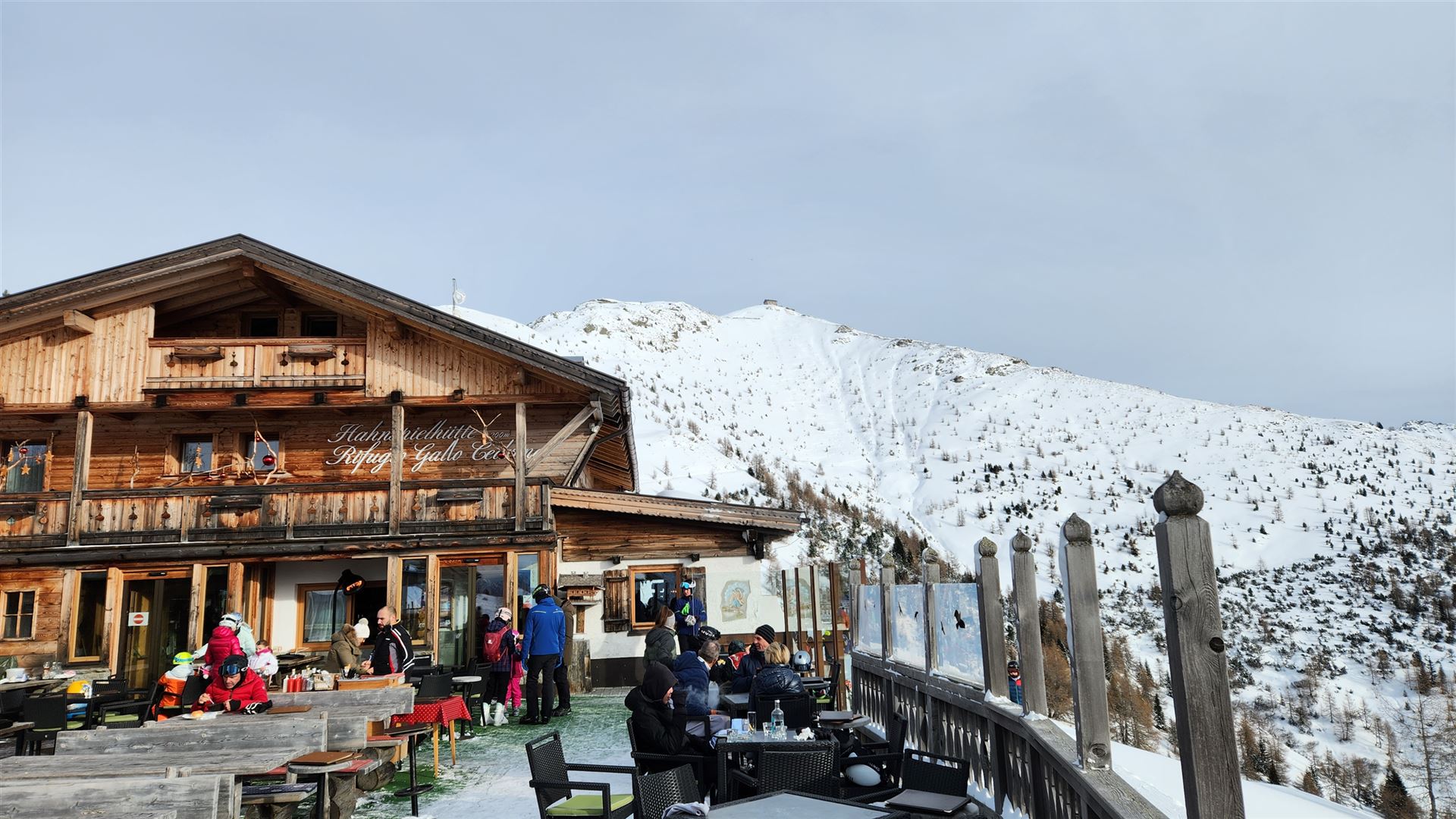 Gleich nach dem Ziehweg erreichten wir das Skigebiet an der Hahnspielhütte, wo wir erst einmal einkehrten. Es stellte sich heraus, dass Andi Kulturhistoriker ist und schon zahlreiche Bücher verfasst hat. So hatten wir ein ausgiebiges Gesprächsthema.