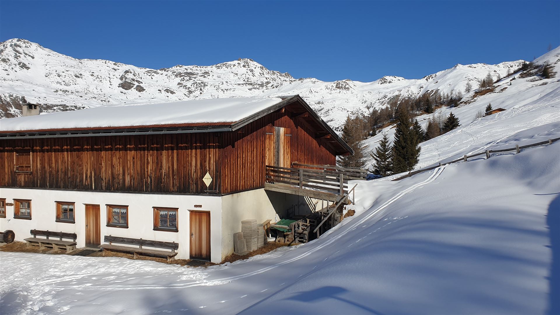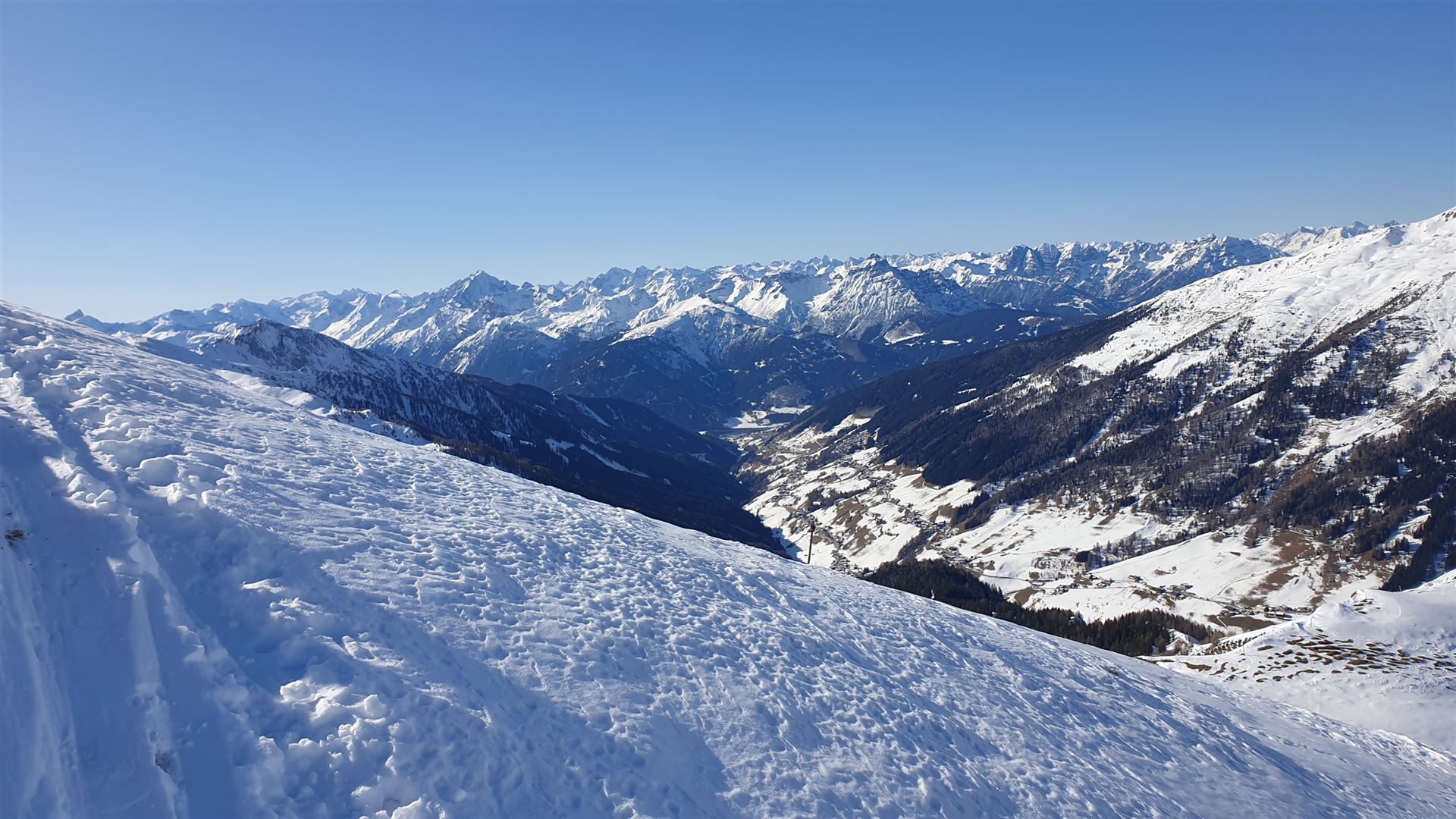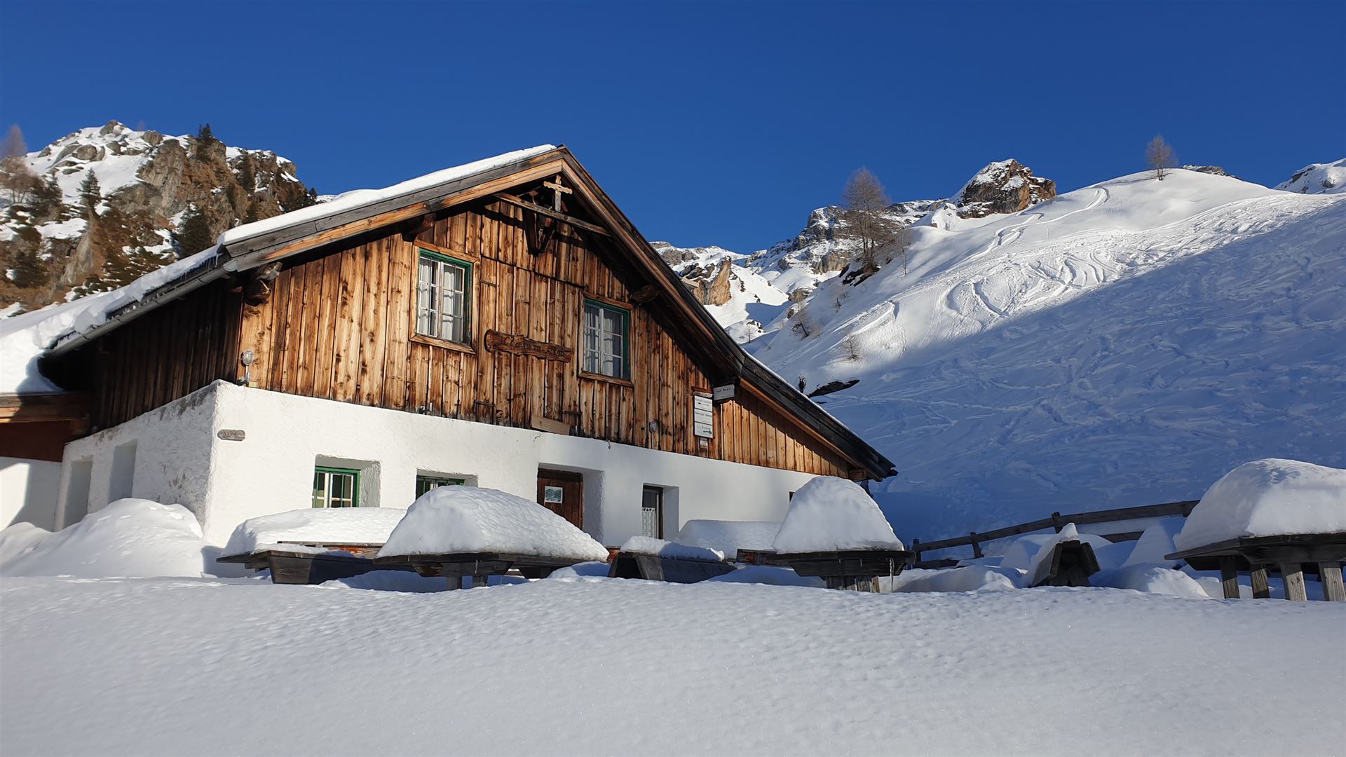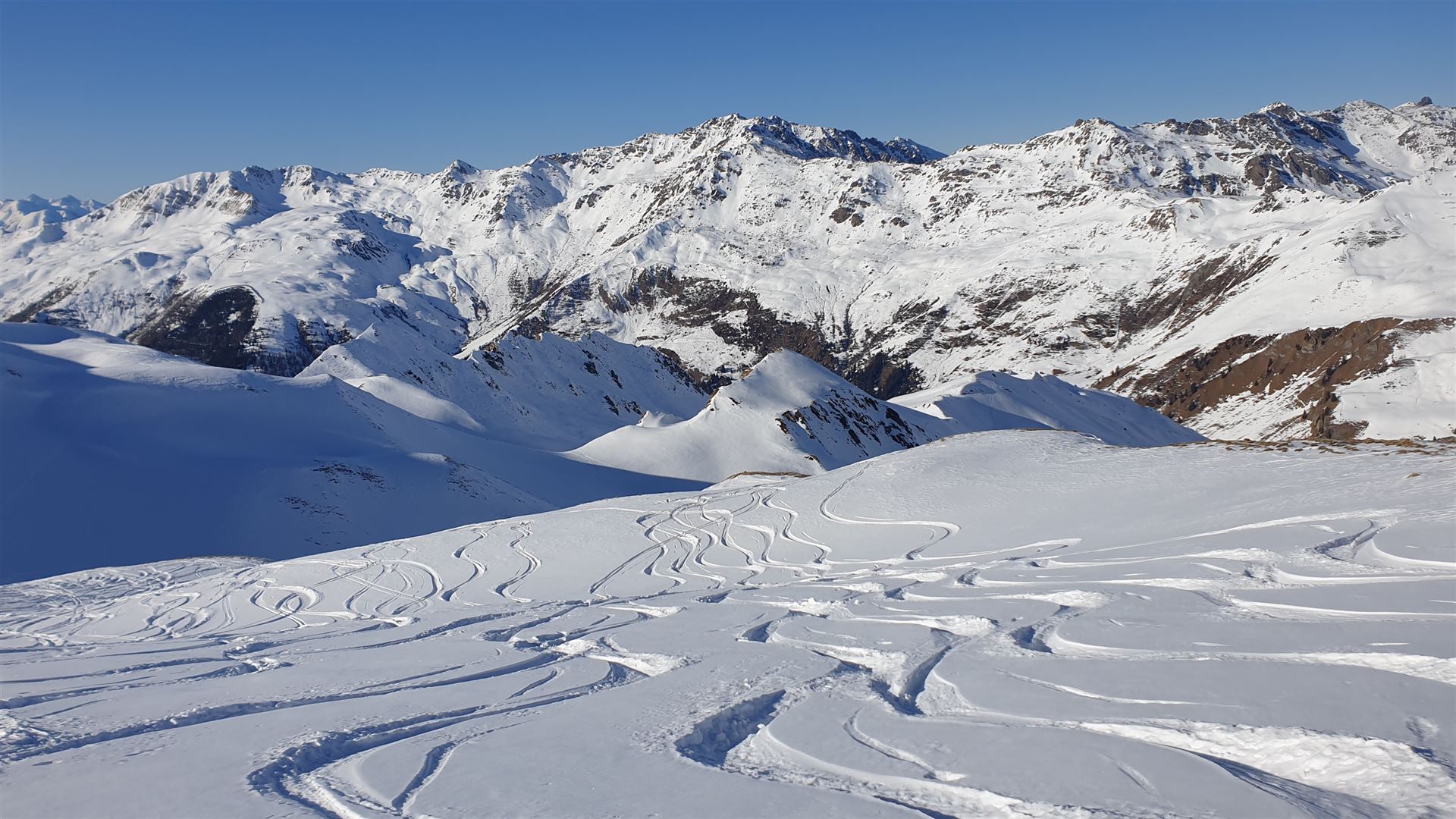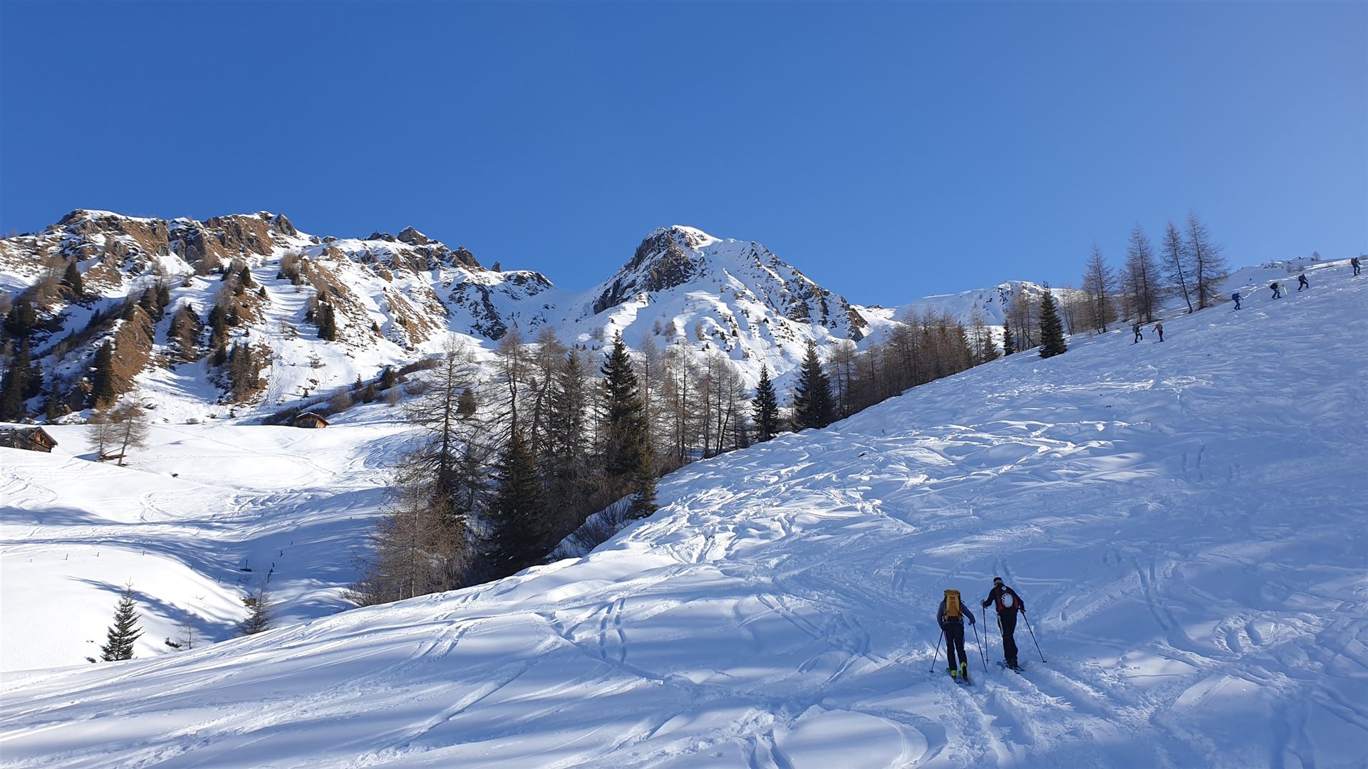 Die Abfahrt erfolgte in einem weiten Bogen nach Osten. Im oberen Bereich fast bis zur Klamm-Alm (1947 m) war überraschend guter Pulverschnee. Von der Klamm-Alm zog es sich dann über Forstwege und entlang des Klammbachs zurück zum Parkplatz. Einmal muss nach links ein Hang gequert werden, um auf den unteren Forstweg, den Schranzbergweg, zu gelangen. Wer dort geradeaus weiterfährt landet beim falschen Parkplatz und muss dann mühsam über einen Kamm gehen.