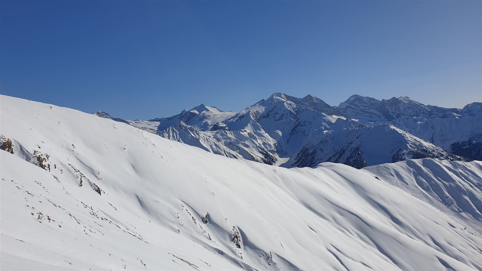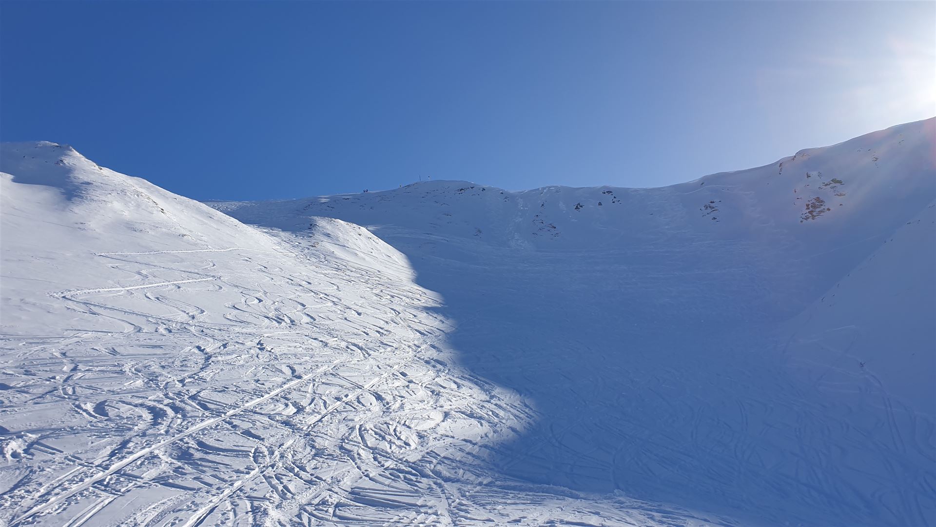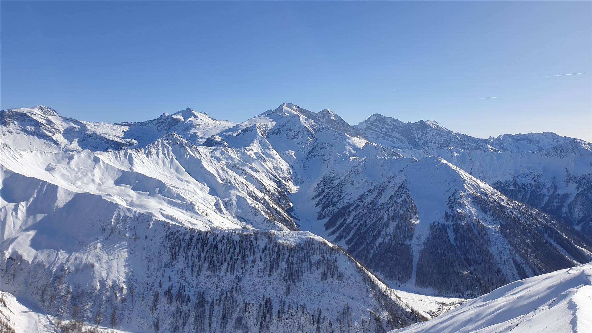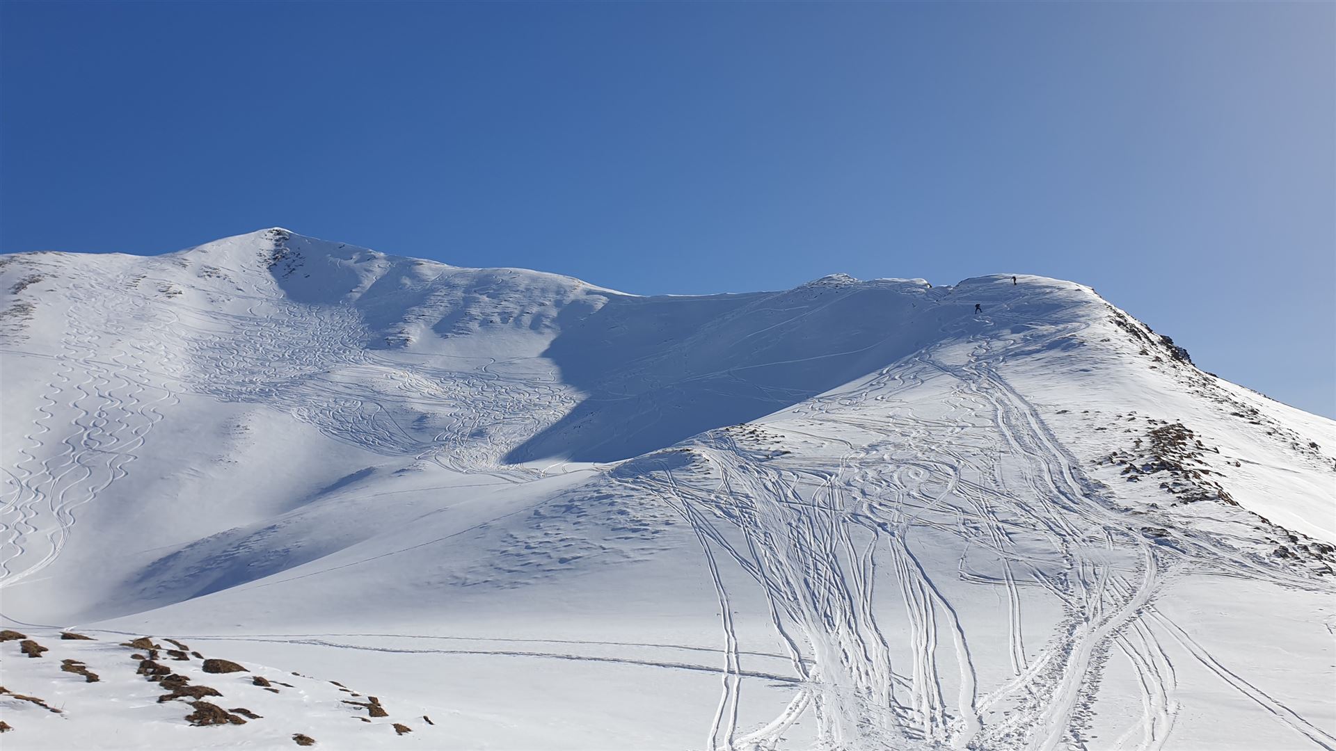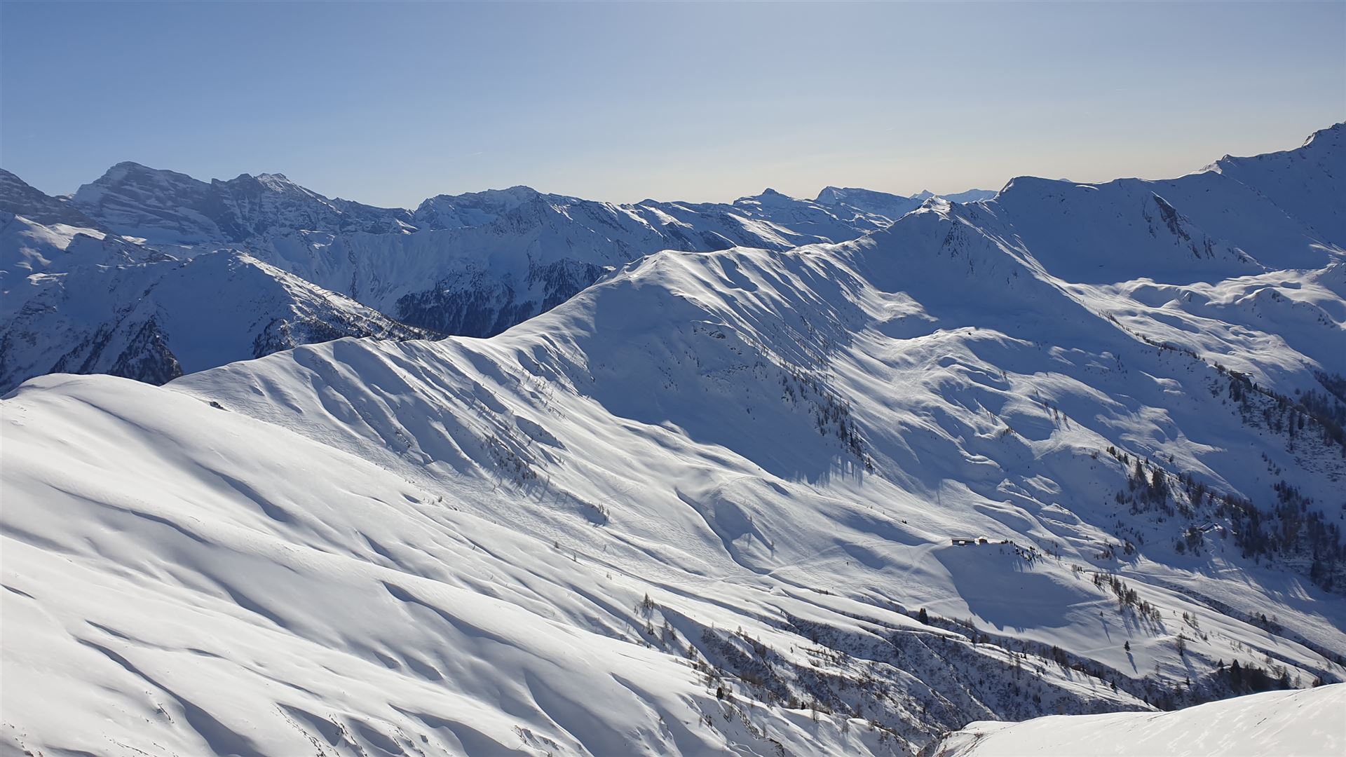 Die Abfahrt erfolgte in einem weiten Bogen nach Osten. Im oberen Bereich fast bis zur Klamm-Alm (1947 m) war überraschend guter Pulverschnee. Von der Klamm-Alm zog es sich dann über Forstwege und entlang des Klammbachs zurück zum Parkplatz. Einmal muss nach links ein Hang gequert werden, um auf den unteren Forstweg, den Schranzbergweg, zu gelangen. Wer dort geradeaus weiterfährt landet beim falschen Parkplatz und muss dann mühsam über einen Kamm gehen.
