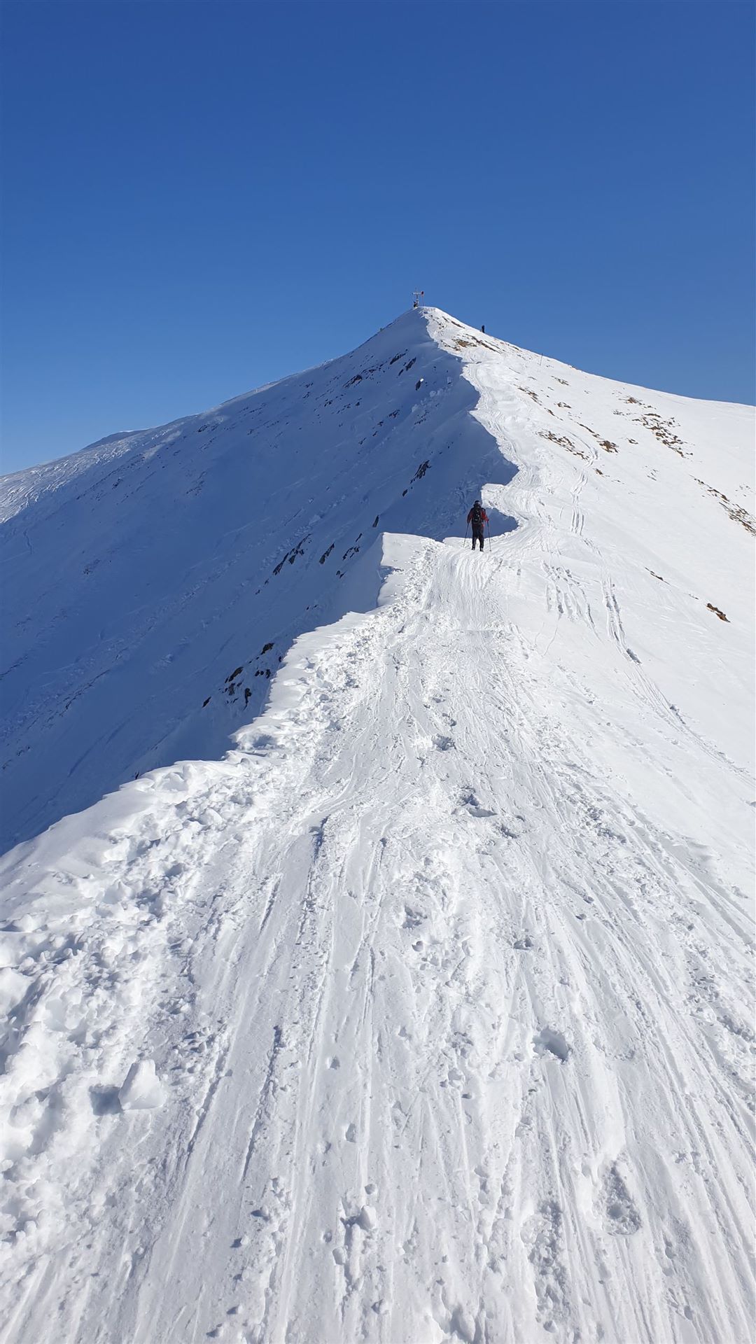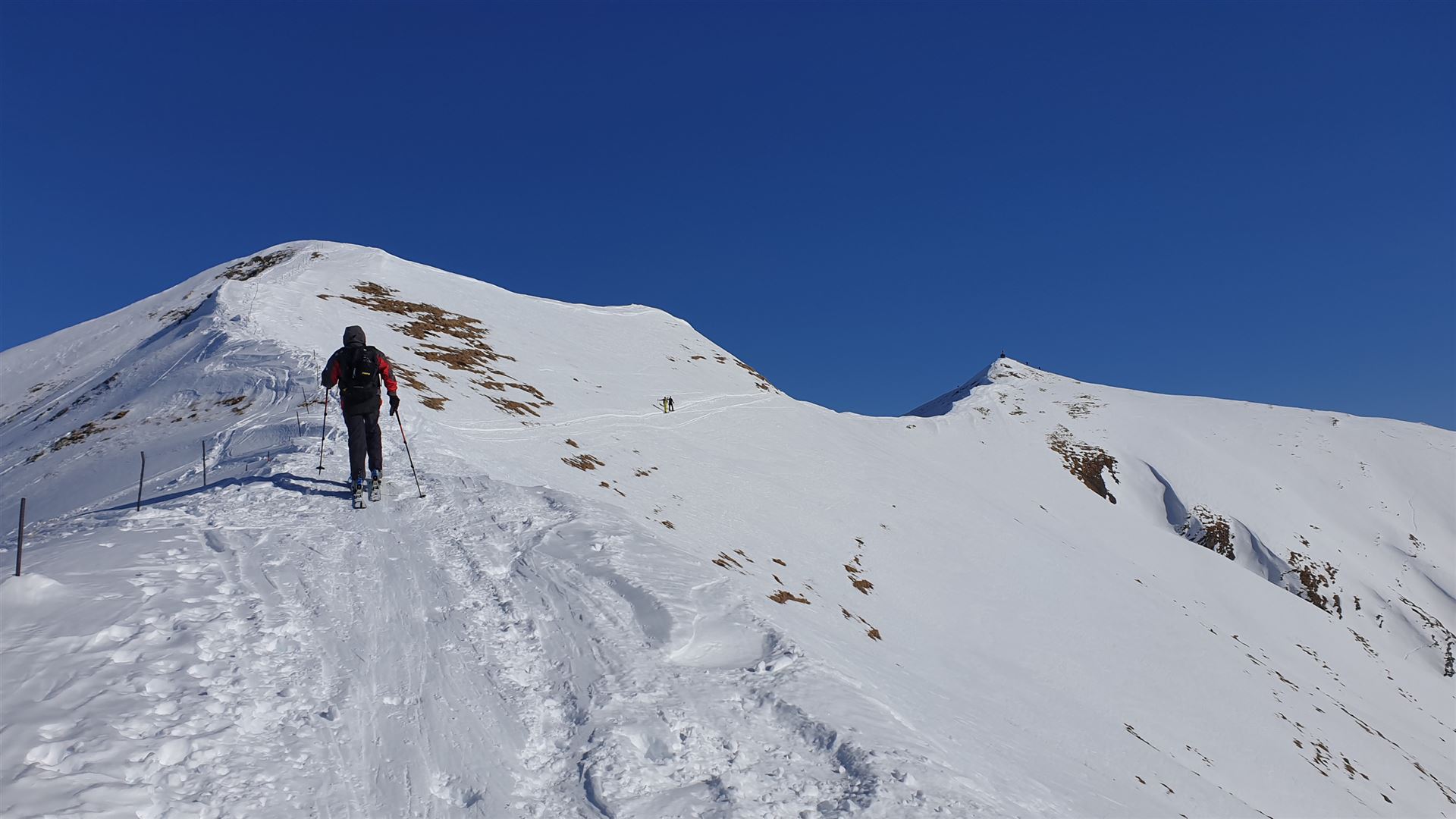 Ausgangspunkt ist der Parkplatz „Schranzbergweg“, der einfach zu finden ist, auf ca. 1400 m Höhe. Die Parkgebühr betrug 4 Euro. Entlang der Rodelbahn ging es kurz bergauf. Dann wechselte ich auf die steilere Skitouren-Schneise bis zur Naviser Hütte, dahinter das Schranzberghaus. Dort ging es nach rechts weg auf dem Forstweg zur Stöcklalm und danach immer der Spur nach Richtung Gipfel. Dieser ist von unten allerdings nicht zu sehen, denn er ist nach hinten versetzt. Sehr schön ist zum Schluss die Hangquerung unterhalb des Gipfels und der einfache Gipfelgrat.