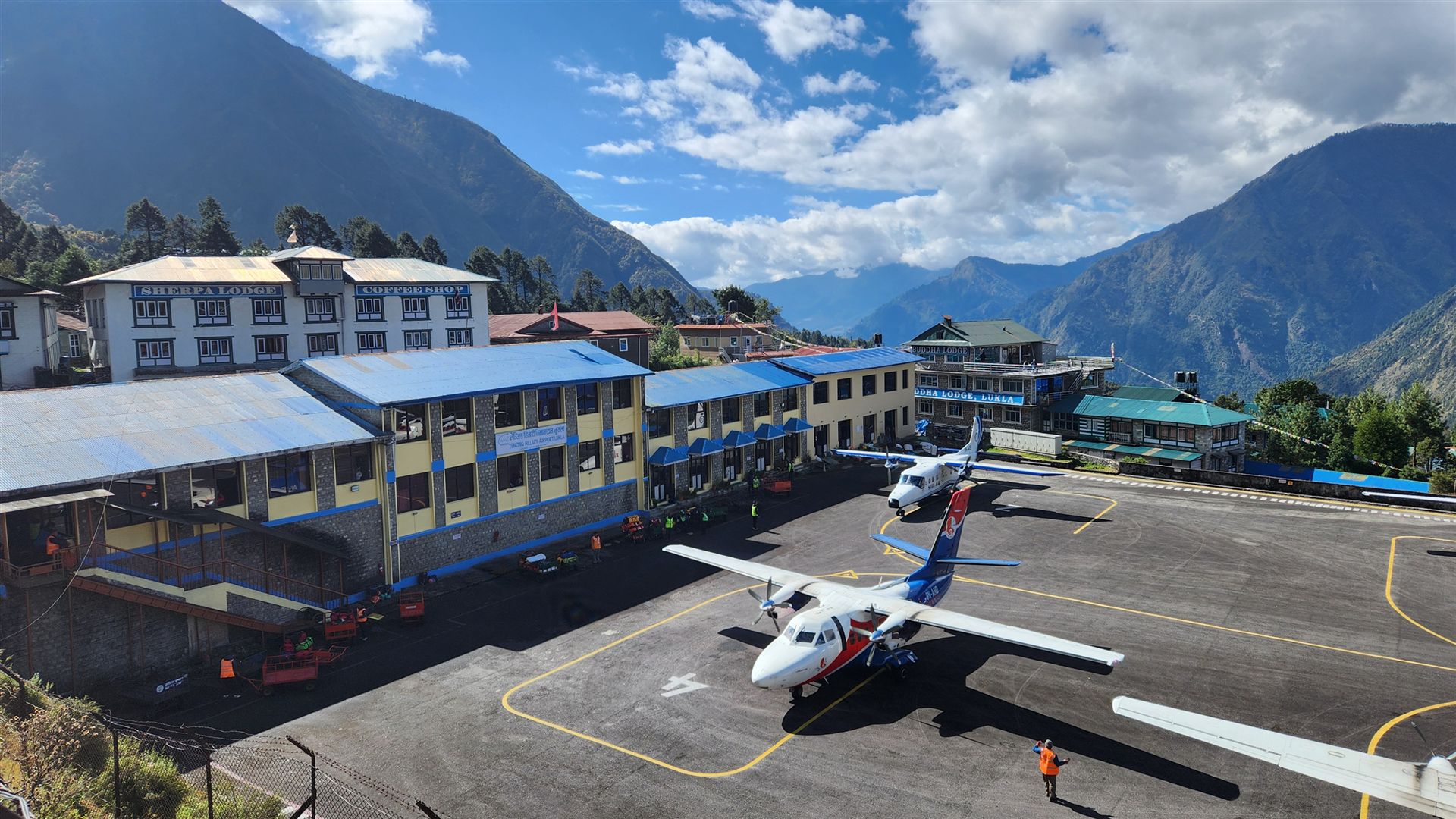 Am Beginn und Ende des Aufenthalts in Nepal sind Puffertage in Kathmandu eingeplant. Denn wenn das Wetter nicht mitspielt, ist es nicht möglich, nach Lukla zu fliegen, denn da wird auf Sicht geflogen. Für diesen Fall muss man mit dem Auto fahren und danach noch zwei Tage nach Lukla laufen. Weiter sei die Straße noch nicht gebaut, so die Auskunft. Wir hatten aber Glück und konnten fliegen. Auf dem Hinweg nach Lukla mussten wir allerdings erst über fünf Stunden zu dem kleinen Flugplatz nach Ramechhap fahren, wobei die Straßen oftmals eine bessere Buckelpiste waren. Fünf Stunden für 130 km sprechen für sich. Einem Teilnehmer war es während der gesamten Fahrt speiübel und wir mussten mehrfach anhalten. Der Flug nach Lukla war dafür sehr angenehm und ruhig.
