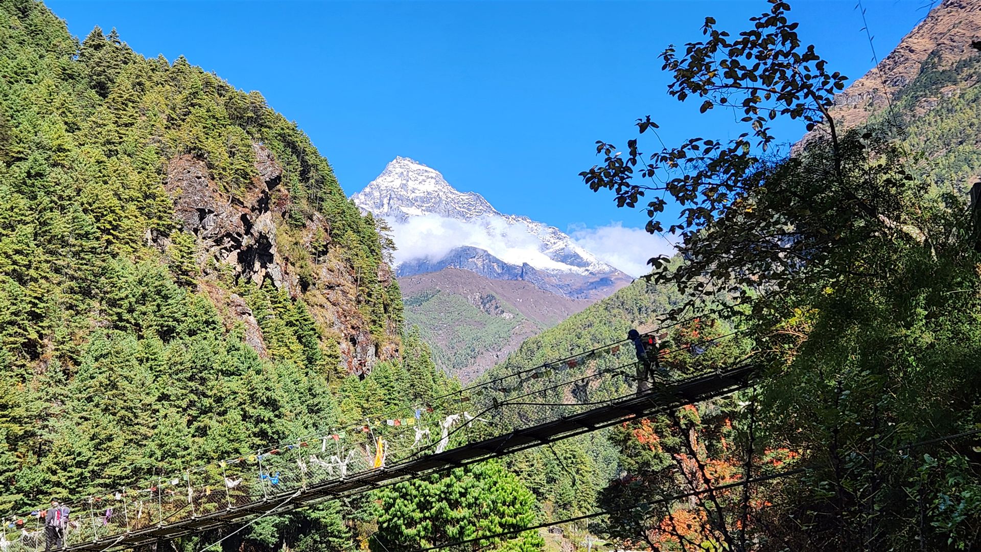 Wanderung nach Namche Bazaar, 3450 m. Dabei Überquerung der bekanntesten Hängebrücke, der Hillary Bridge, die auch für Bungie-Sprünge Verwendung findet. Erster Blick auf den Mt. Everest zwischen den Baum-Wipfeln. In Namche Bazaar kurze Wanderung hinauf zum Tenzing Norgay Sherpa Heritage Center.