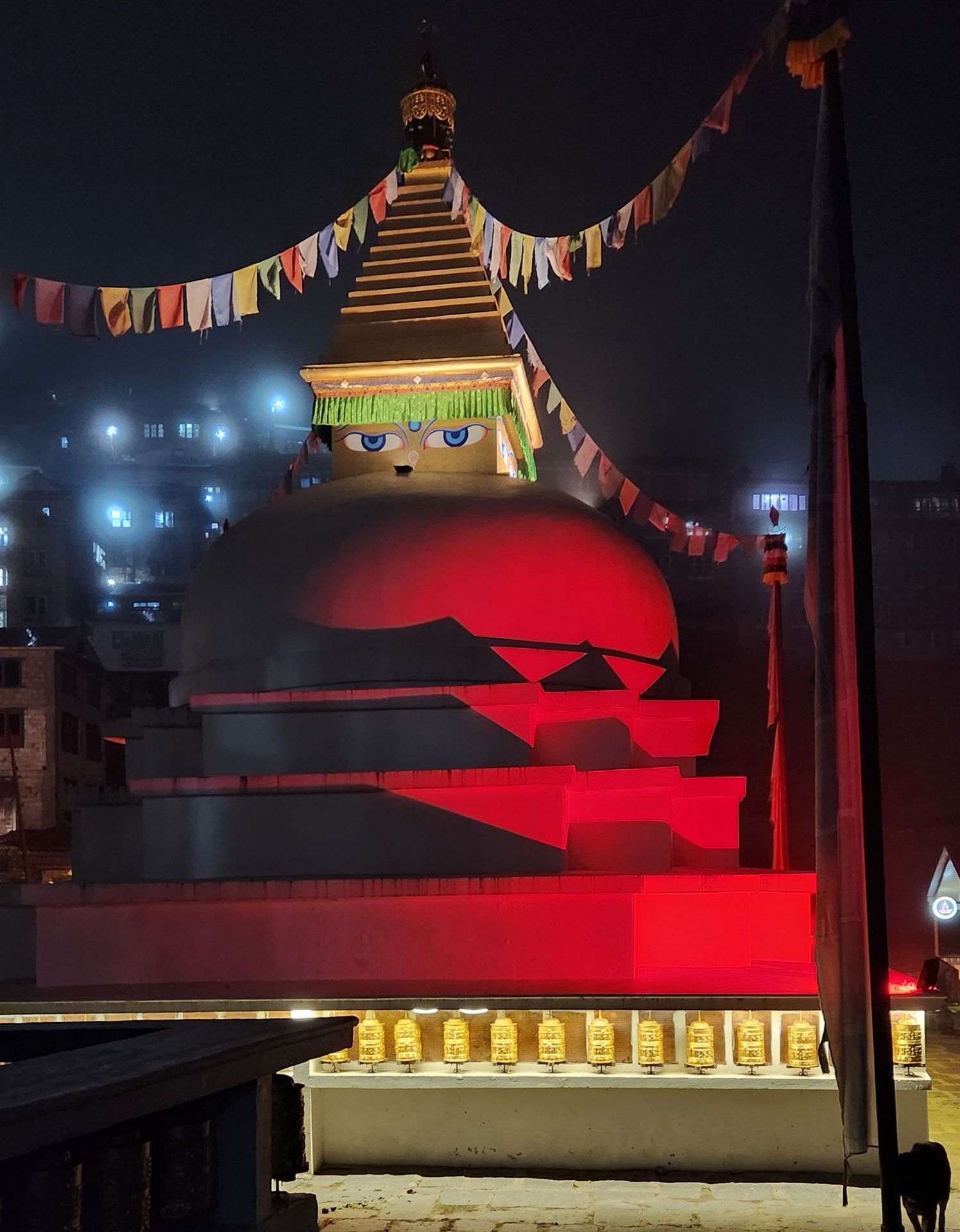 Verbreitet sind auch Stupas mit weißem Anstrich, den Augen Buddhas und goldenen Spitzen. Es gibt sie in allen möglichen Größen. Die größte Stupa freilich besichtigten wir in Kathmandu, die Boudhanath Stupa. Nicht weit davon entfernt befindet sich die Shechen Monastery, der Gebetsraum war unter Mittag jedoch verschlossen.