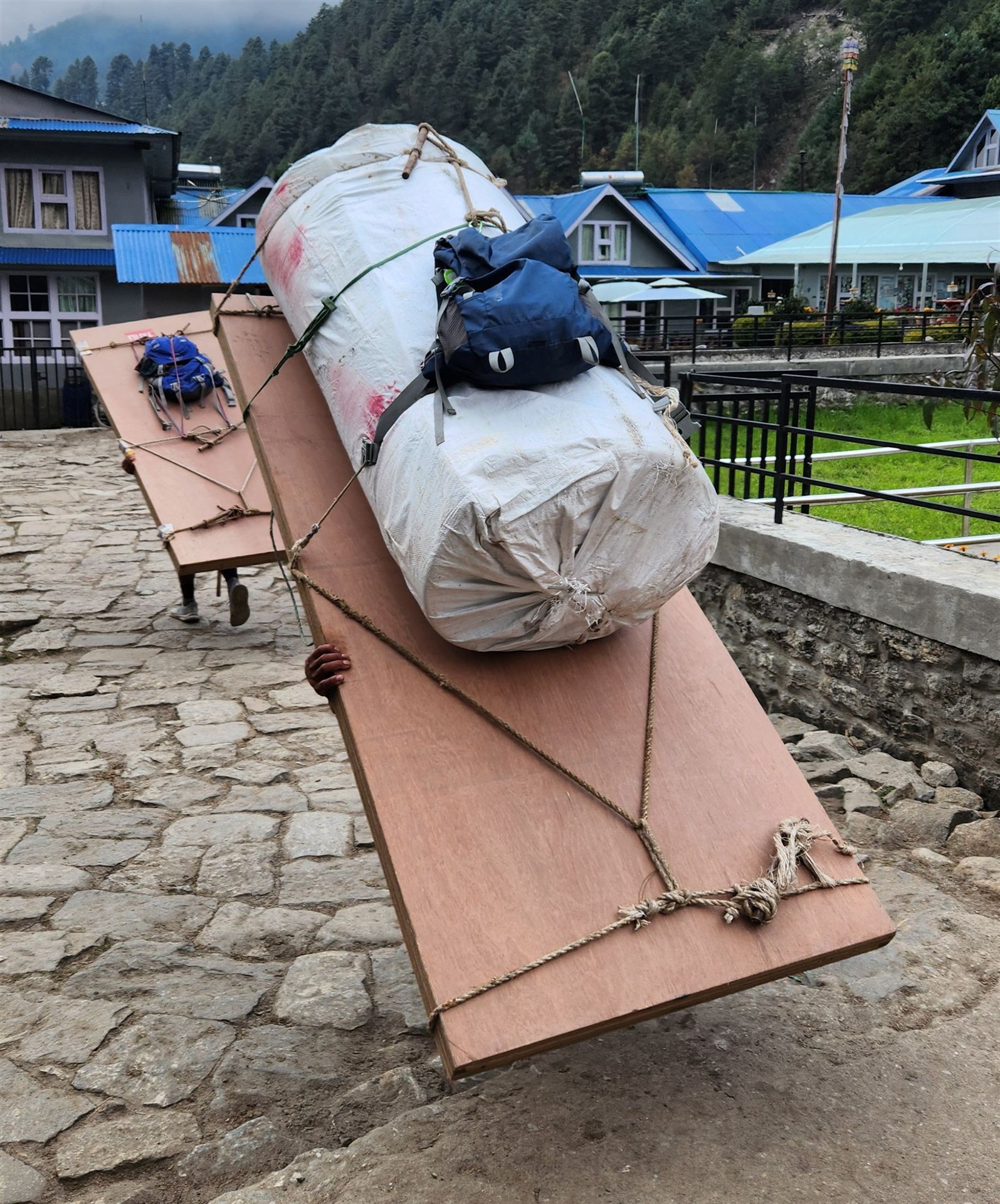 Zwischen Lukla und Gorak Shep, dem letzten Ort vor dem Everest Base Camp, sowie in die Seitentäler, herrscht ein reger „Verkehr“. Nein, keine Autos. Dort gibt es keine Autos. Die Warentransporte werden vielmehr mit Mulis, in größeren Höhen mit Yaks und mit Trägern durchgeführt. Ich hatte den Eindruck, dass diejenigen, die sich Mulis und Yaks leisten können, die Waren mit den Tieren transportieren, während die Ärmeren alles auf dem Rücken tragen, was wirklich erstaunlich ist. Da werden ganze Bauelemente getragen, die durchaus 100 kg wiegen (siehe Foto). Und das wird dann über mehrere Tage zum Zielort geschleppt! Die Bezahlung erfolgt angeblich nach Gewicht. Einleuchtend finde ich das nicht. Aber vielleicht ist es auch nicht möglich, die unhandlichen Bauteile auf ein Muli oder Yak zu spannen.