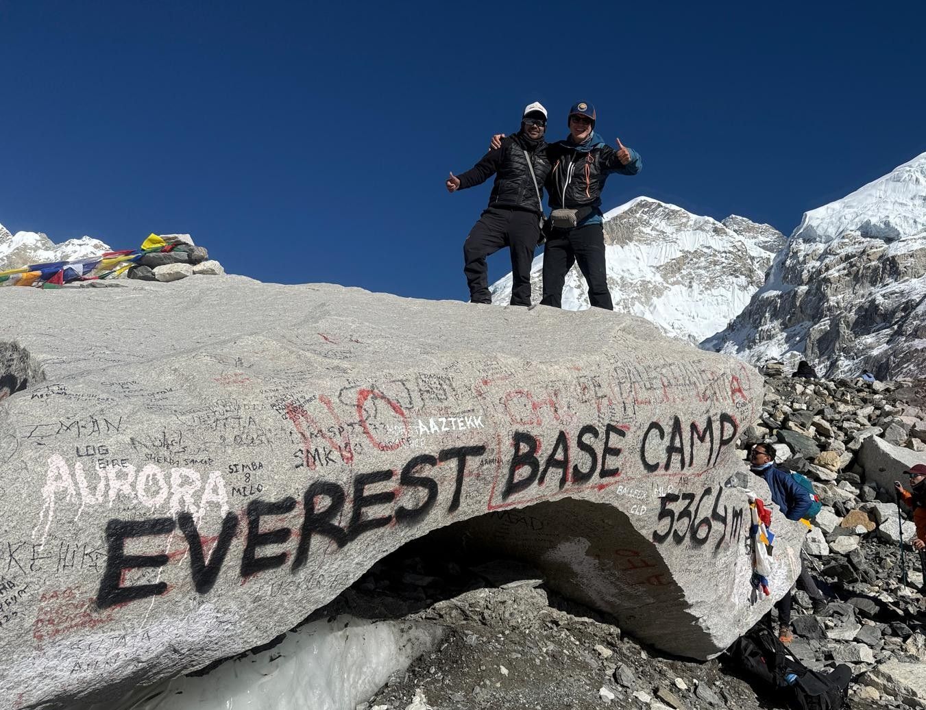 Für unsere 6er-Gruppe hatten wir zwei nepalesische Guides, Amrit und Keshav. Die Verständigung klappte im Englischen recht gut. Amrit hatte die Hauptverantwortung und ist ein Organisations-Genie. Er kümmerte sich um den gesamten Ablauf, vom Tourverlauf bis zur Reservierung der nächsten Lodge. Beim Wandern war er meistens an der Spitze, während Keshav sozusagen den Lumpensammler stellte, damit niemand verlorenging. Die beiden waren extrem aufmerksam. Ihnen entging nichts. Sie hüteten uns wie ein Schafhirte seine Schafe. Selbst wenn man zur Toilette ging und den Weg nicht gleich fand, tauchten sie plötzlich auf, als hätten sie ihre Augen überall. Aber die beiden machten nicht nur ihre Arbeit. Es sind zwei richtig nette Kerle und sie sind uns regelrecht ans Herz gewachsen. Das Foto zeigt mich mit Amrit im Everest Base Camp.