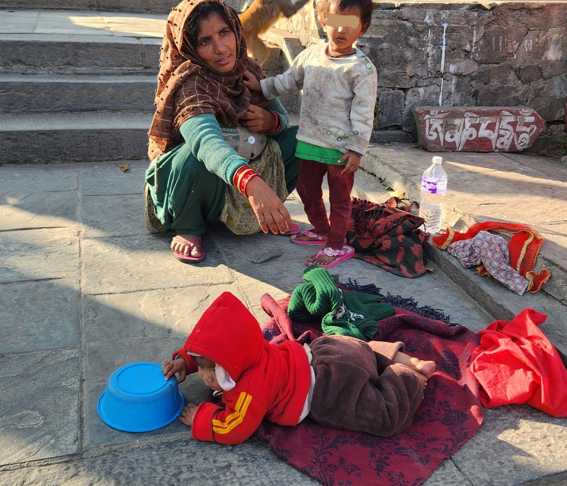 Auf das bedauernswerte Gegenteil dieser offenbar heilen Welt trafen wir am Affentempel. Dort bettelte eine Mutter und ein Kind war barfuß und lag auf dem Boden, obwohl es ja einigermaßen kalt war (siehe Foto). Ich spendete ein paar hundert Rupien und wurde im Nachhinein aufgeklärt, dass es sich dabei um indische Bettlerbanden handelt, die die Kinder ausnützen, um Mitleid zu erregen. Manchmal zahlt man halt Lehrgeld.
