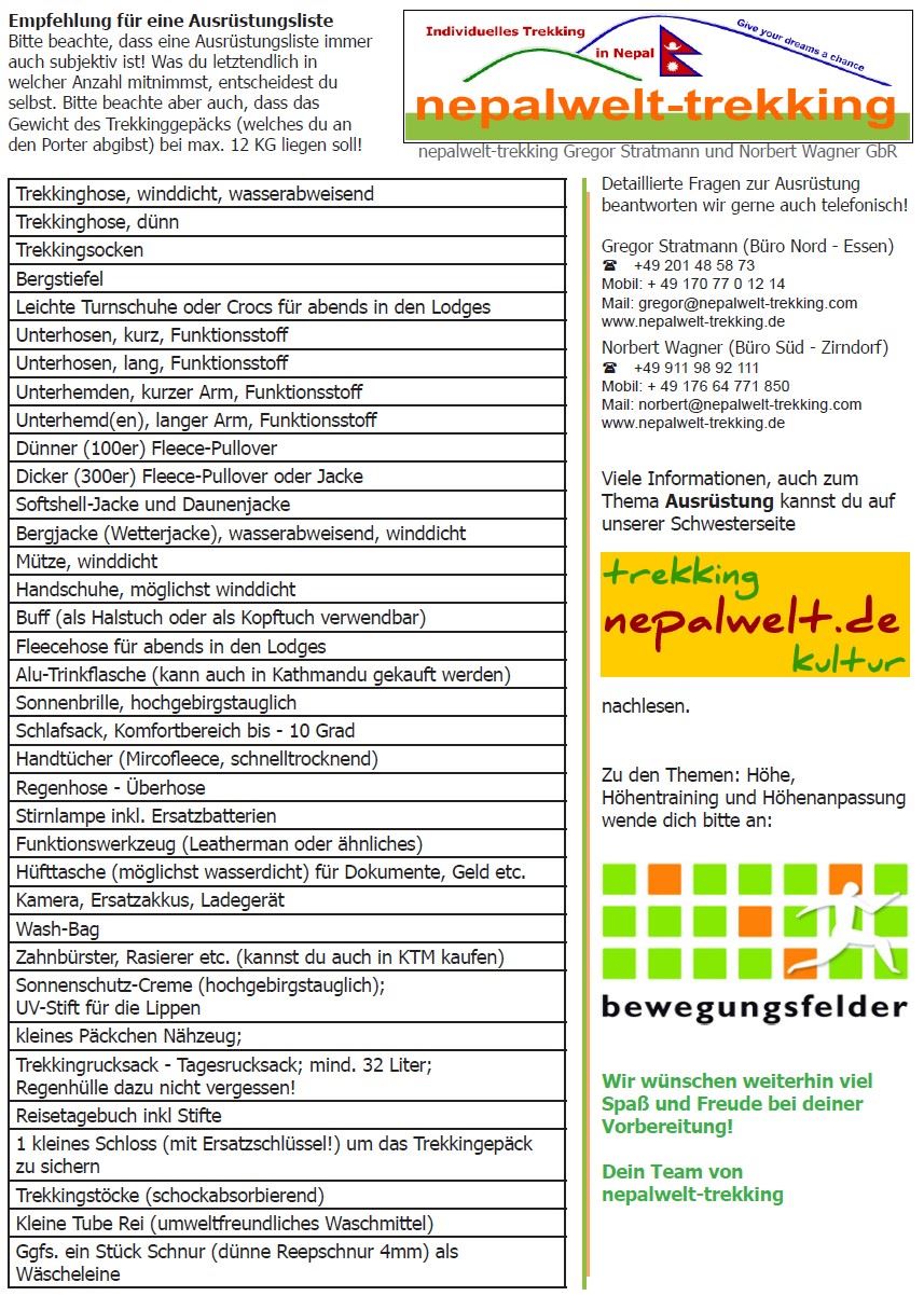 Die Original-Ausrüstungsliste von Nepalwelt-Trekking umfasst das Notwendigste. Ich empfehle meine detaillierte Ausrüstungsliste. Die weiblichen Gruppenteilnehmer würden angesichts der nächtlichen Kälte beim nächsten Mal eine Wärmflasche mitnehmen. Ich wurde beauftragt, darauf explizit hinzuweisen. LOL.
