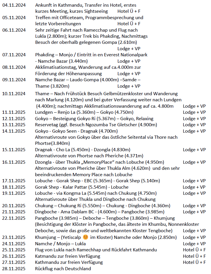 Am 3. November 2025 ging der Flug von München über Dubai nach Kathmandu. Nach zwei Nächten in Kathmandu folgten die lange Fahrt nach Ramechhap und der Flug nach Lukla in den Bergen. Dort startete die dreiwöchige Wanderung. Am Ende der Reise waren nochmals drei Tage in Kathmandu vorgesehen, für Sightseeing und Shopping.