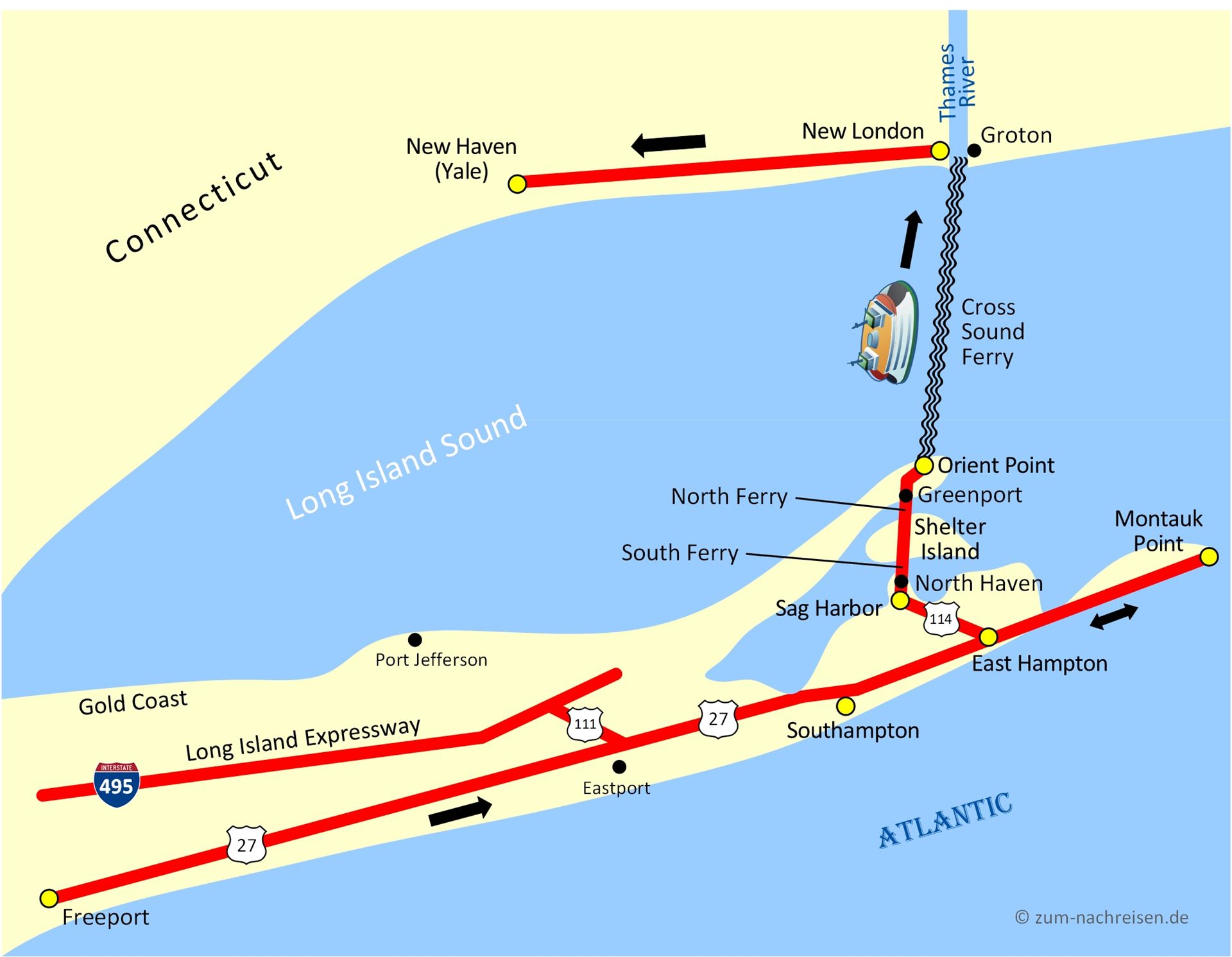 Freeport → 75 Meilen → Southampton → 40 Meilen → Montauk Point → 20 Meilen → East Hampton → 7 Meilen → Sag Harbor → 4 Meilen → Fähre nach Shelter Island (Überfahrt 500 m) → 4,5 Meilen → Fähre nach Greenport (Überfahrt 1 km) → 9 Meilen → Orient Point → Fähre nach Connecticut (1,5 Stunden) → New London → 50 Meilen → Hotel (1. Nacht von 2 in New Haven)