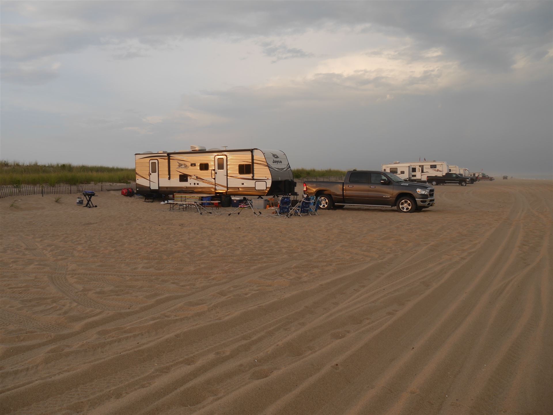 Nach 4 Meilen endet die Sackgasse vor einem Campingplatz (campground) mit Wohnmobil-Stellplätzen unmittelbar am Sandstrand. Links neben dem Eingang befindet sich die Anmeldung in einer Holzbaracke. Du kannst fragen, ob du hineinfahren und kurz parken darfst, um dir den Campground anzuschauen. Vom Parkplatz läufst du entlang der Sandfahrspuren über die Dünen zu den Ocean Camp Sites, den Stellplätzen auf der Atlantikseite.