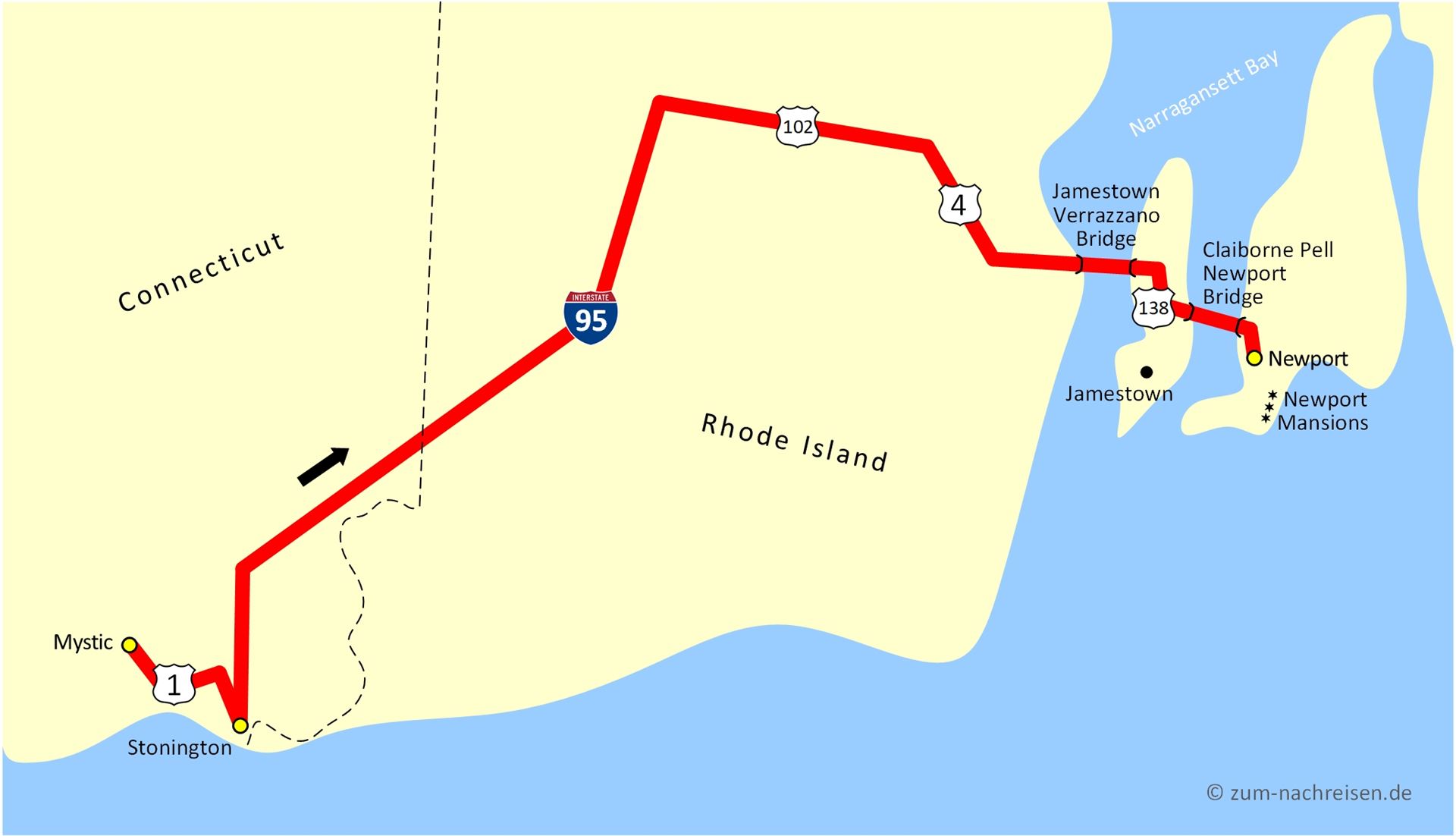Nachdem du dir einen Eindruck von Stonington verschafft hast, fährst du zu deinem heutigen Übernachtungsziel in Newport. Nach etwa 10 Meilen erreichst du den Bundesstaat Rhode Island. Auf dem Weg nach Downtown Newport überquerst du die Narragansett Bay, zunächst auf der Jamestown Verrazzano Bridge und kurz darauf über die Claiborne Pell Newport Bridge. Die erste Ausfahrt nach der Brücke ist Downtown Newport. Die Stadt Newport liegt auf der Insel Rhode Island, die den gleichen Namen wie der Bundesstaat trägt. Sie wird von den Mündungen des Providence River und des Taunton River in den Atlantik umschlossen.