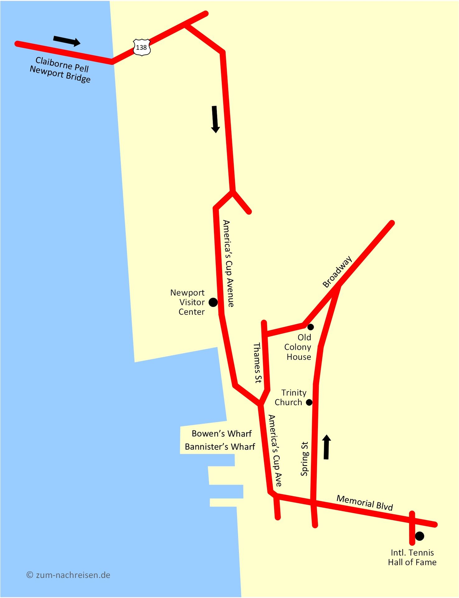 Zum Abschluss deines Aufenthalts in Newport fährst du durch die Altstadt entlang der Spring Street mit ihren liebevoll restaurierten Häusern aus der Kolonialzeit. An vielen Gebäuden sind Schilder mit Jahreszahl, Name und Berufsangabe der ursprünglichen Besitzer angebracht. Die Spring Street ist eine Einbahnstraße. Am besten, du startest an der Kreuzung Memorial Boulevard / Spring Street. Die Navi-Adresse gehört zu einem dort gelegenen Gebäude. Du fährst eine Meile in nördliche Richtung bis zum Broadway.