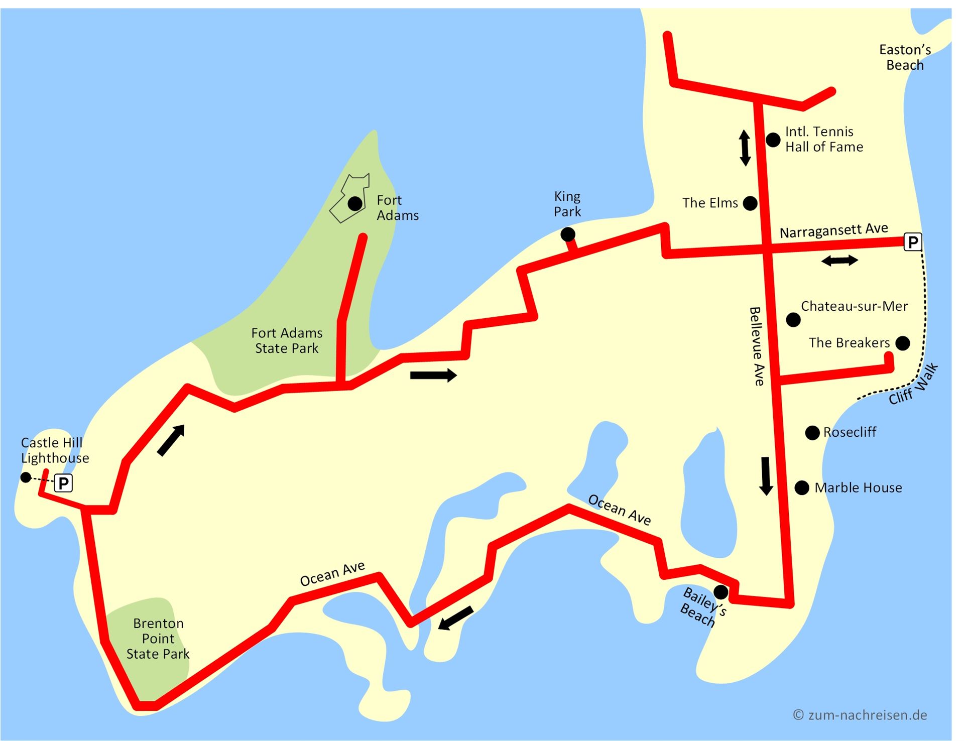 Hotel → wenige Meilen → Newport Mansions → Scenic Ocean Drive (10 Meilen) → Downtown Newport → 60 Meilen → Hotel (1. Nacht in Sandwich)