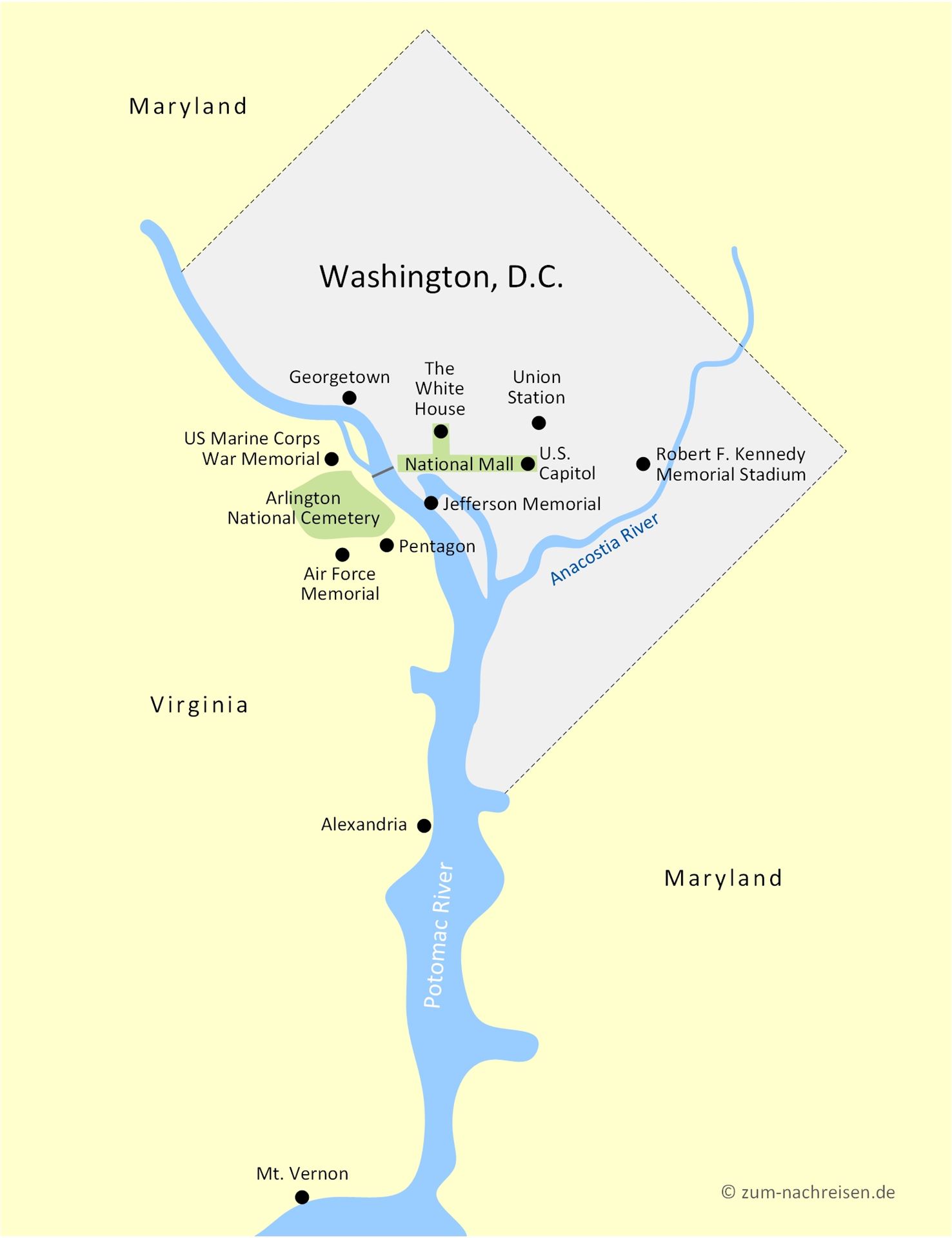 Der Großraum Washington DC schließt weite Teile von Virginia und Maryland mit ein. Es ist keine gewachsene, sondern eine geplante Stadt, die den neu gegründeten Vereinigten Staaten einen gemeinsamen, symbolträchtigen Regierungssitz gab. Zu diesem Zweck traten Maryland und Virginia im Jahr 1790 einen Teil ihres jeweiligen Staatsgebiets ab, vorwiegend Sumpfland. Das ergab ein Quadrat mit exakt 10 Meilen Kantenlänge, dessen Ecken in die vier Himmelsrichtungen zeigten. Der französische Architekt, Pierre Charles L’Enfant, der im Unabhängigkeitskrieg unter George Washington gegen die Briten gekämpft hatte, erhielt 1792 den Auftrag, die neue Hauptstadt zu entwerfen. Sein Plan sah Prachtstraßen und monumentale Gebäude vor, wie er sie aus seiner Heimatstadt Paris kannte.