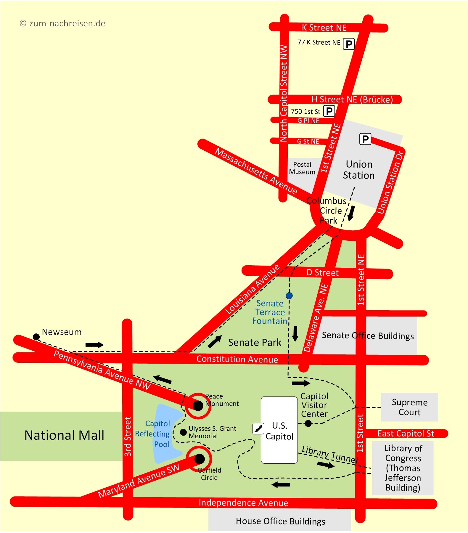 Vom Columbus Circle Park gehst du schräg durch die gegenüberliegende Grünanlage zur D Street und auf der anderen Straßenseite in den Lower Senate Park. Von der Senate Terrace Fountain hast du einen ersten herrlichen Blick auf die Kuppel des Kapitols. Durch den Upper Senate Park gelangst du zur Constitution Avenue. Wende dich nach links. Am Ende des Parks befinden sich zur Linken die Bürogebäude des Senats. Gehe durch die Grünanlage hinter dem Kapitol zur First Street. Dort ist der Oberste Gerichtshof (Supreme Court) angesiedelt. Der Eingang zum Capitol Visitor Center befindet sich gegenüber auf der Ostseite des Kapitols.