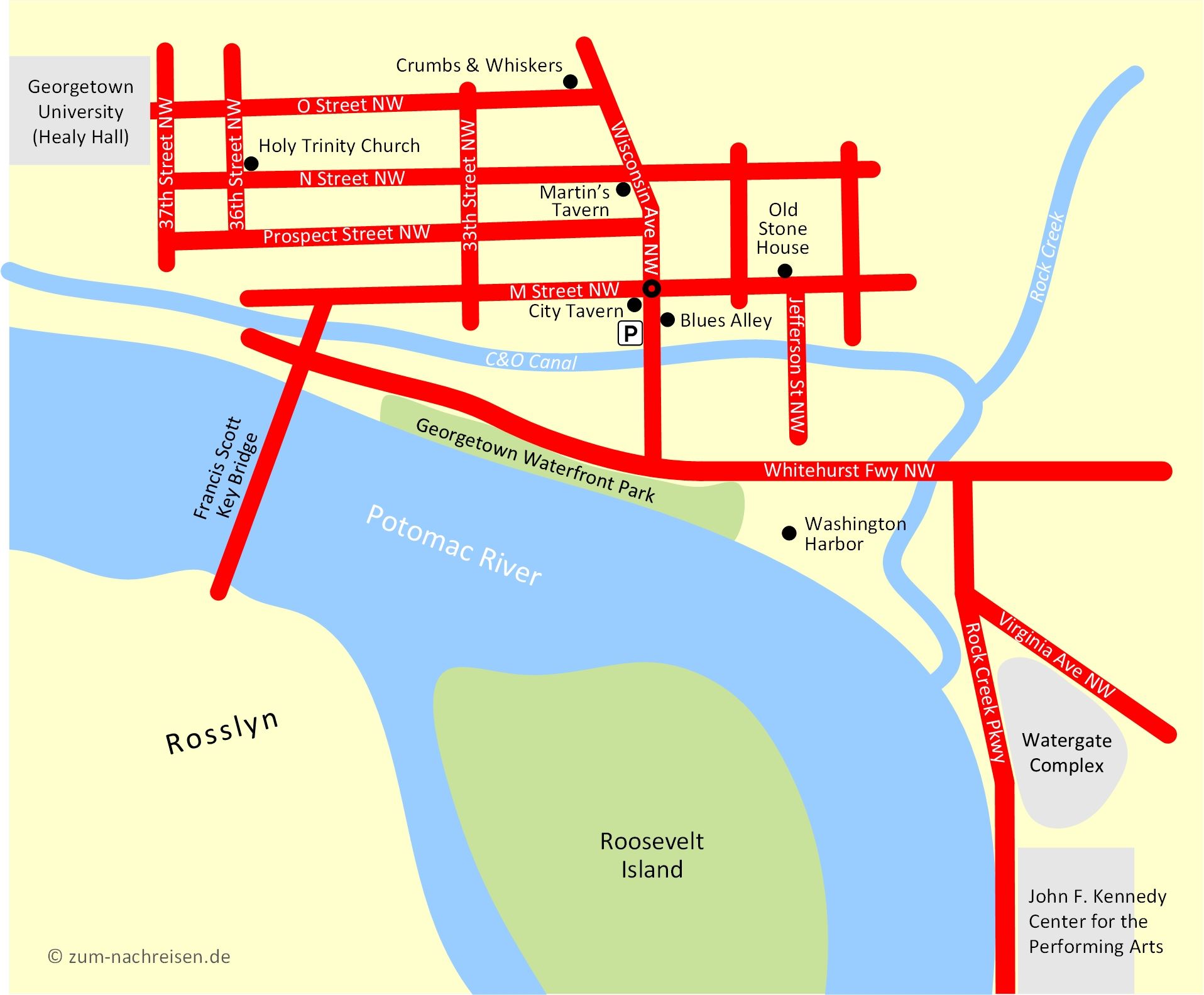 Für den Abend empfehle ich einen Besuch von Georgetown, den ältesten Stadtteil von Washington DC. Georgetown wurde 1751 als Tabakhafen am Potomac River gegründet, also etwa vier Jahrzehnte, bevor Pierre Charles L’Enfant den Auftrag erhielt, Washington DC zu planen. Das Areal am Fluss ist heute eine Flaniermeile. Rund um die Kreuzung M Street/Wisconsin Avenue liegt das Zentrum von Georgetown mit zahlreichen Geschäften und Restaurants. In den Seitenstraßen befinden sich gepflegte Stadthäuser.