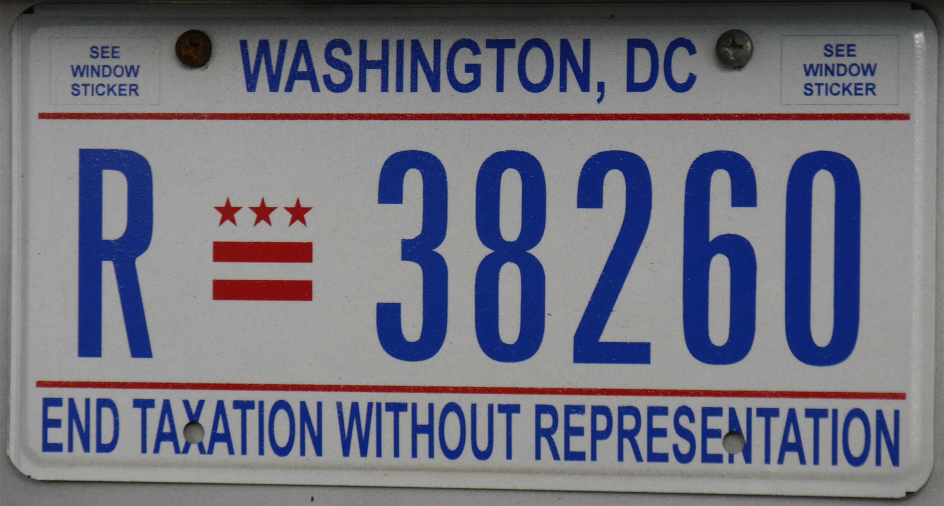 Washington DC ist das politische Machtzentrum, aber kein Bundesstaat der Vereinigten Staaten. Der Distrikt ist direkt dem Kongress unterstellt und verfügt selbst über keine volle Vertretung im Kongress. Die Bewohner von Washington DC können deshalb bei Wahlen nur wenig Einfluss nehmen, was auf den meisten Autokennzeichen angeprangert wird: „End taxation without representation“ (Schluss mit der Besteuerung ohne Vertretung) erinnert an die Proteste der Bürger während der Boston Tea Party: „No taxation without representation“ (siehe Tag 10).