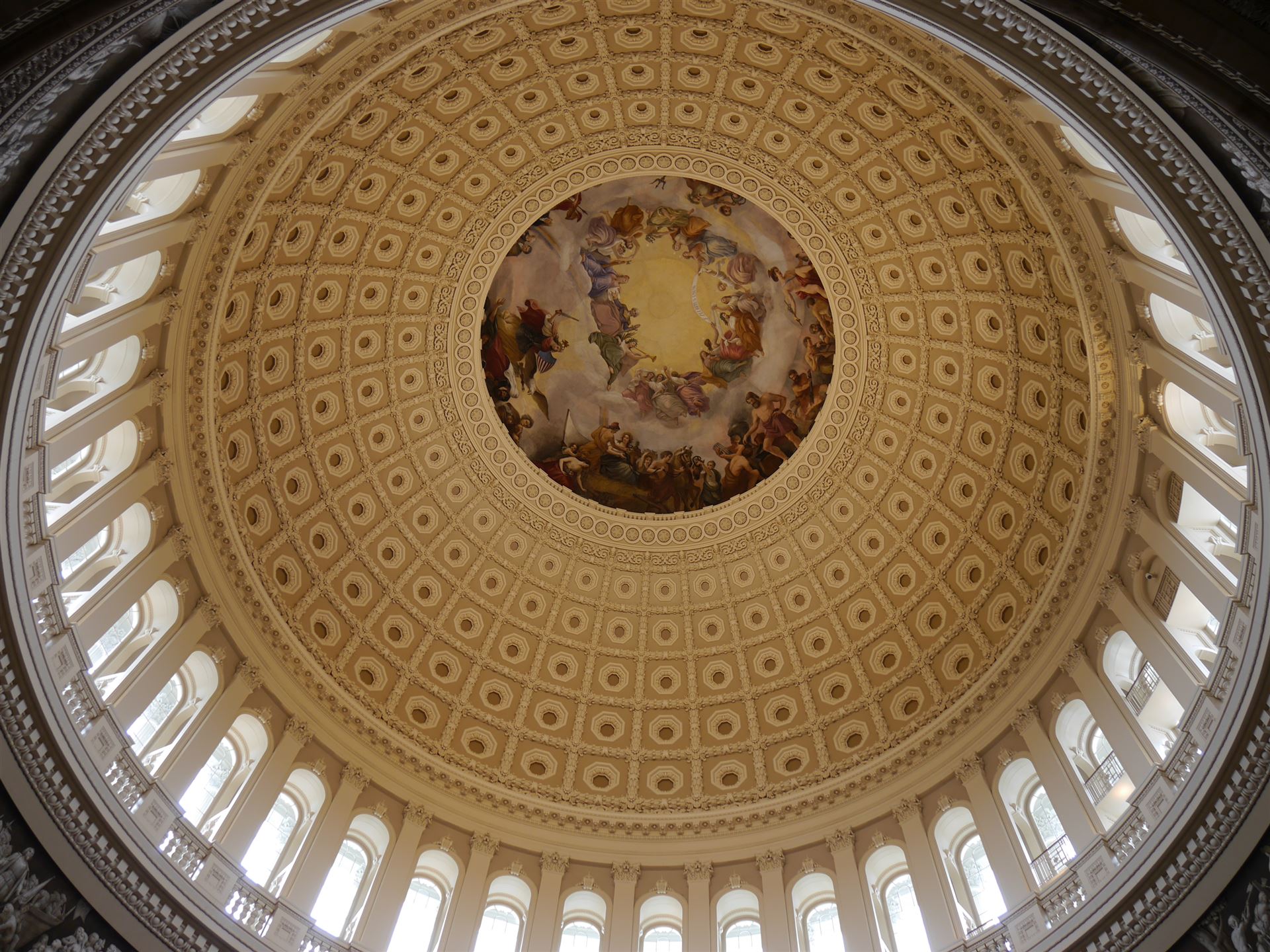 Von der Krypta führt eine Treppe hinauf in die kreisförmige Rotunde (rotunda) mit knapp 30 Metern Durchmessern. Du stehst jetzt unter der fast 55 Meter hohen Kuppel des Kapitols (Capitol Dome). Die 46 Meter hohe Freiheitsstatue fände darin problemlos Platz. Die Rotunde dient festlichen Anlässen. Hier werden ausländische Staatsoberhäupter empfangen, aber auch verstorbene Präsidenten aufgebahrt. Rundherum sind auf großen Gemälden die wichtigsten Ereignisse der amerikanischen Geschichte dargestellt, zum Beispiel die Einschiffung der Pilgerväter (Embarkation of the Pilgrims), die Unterzeichnung der Unabhängigkeitserklärung (Declaration of Independence) und Pocahontas Taufe (Baptism of Pocahontas, siehe dazu im Folgenden). Das Deckenfresko des italienischen Künstlers Constantino Brumidi, die Apotheose Washingtons, stellt George Washington als gottähnliche Gestalt dar. Mehrere Präsidentenstatuen sowie eine Bronzebüste des Bürgerrechtlers Martin Luther King Jr. runden das Bild ab.