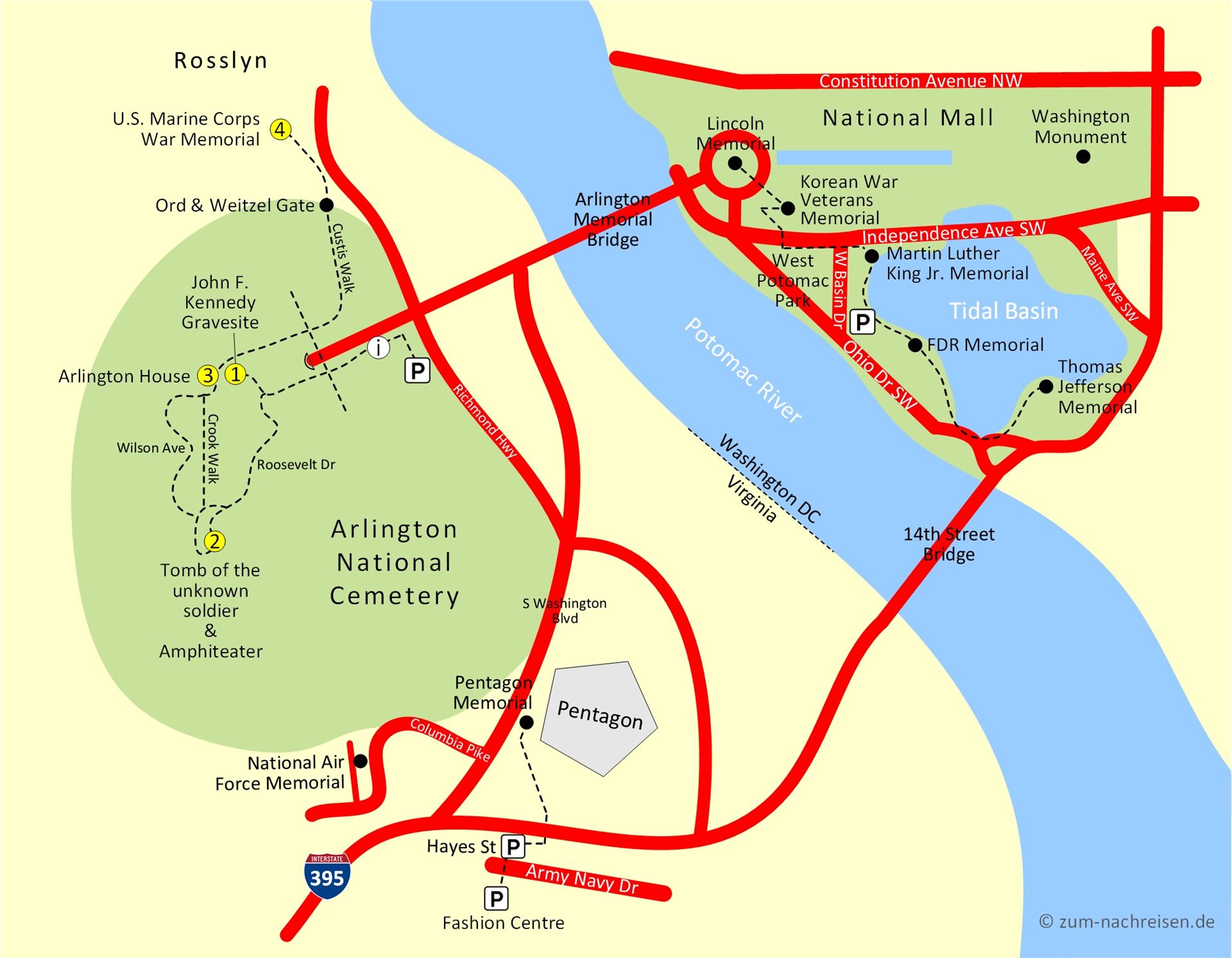 Hotel → wenige Meilen → Arlington National Cemetery → 3 Meilen → Pentagon → 1 Meile → National Air Force Memorial → 3 Meilen → West Potomac Park → wenige Meilen → Hotel (4. Nacht in Washington DC)