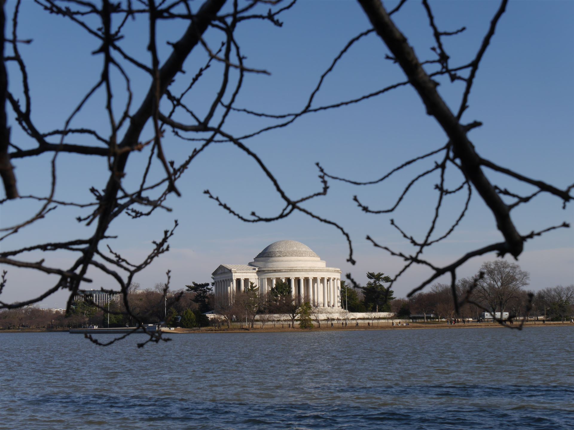 Der Kuppelbau des Jefferson Memorial ist dem römischen Pantheon nachempfunden. An der Südseite des Tidal Basin bildet es einen herausragenden Blickfang. In seiner Mitte steht die Statue von Thomas Jefferson, dem dritten Präsidenten und Verfasser der Unabhängigkeitserklärung. Zieht man eine Linie vom Jefferson Memorial zum Weißen Haus, dann verläuft diese über den Jefferson Pier Marker (siehe gestern) senkrecht zur National Mall. Deshalb ist in Filmen und Nachrichtensendungen, in denen die Rückseite des Weißen Hauses aus einer erhöhten Position gezeigt wird, das Jefferson Memorial regelmäßig im Hintergrund zu sehen. Die Entfernung zum Weißen Haus beträgt gut eine Meile.