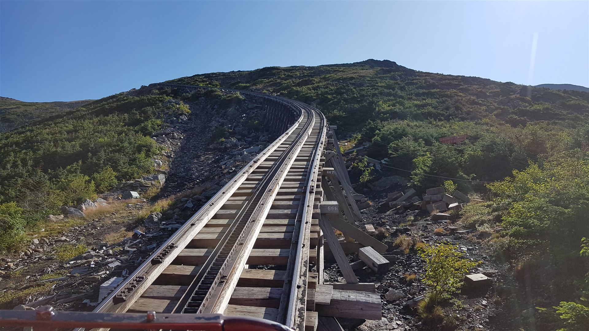 Es gibt zwei Möglichkeiten, den Gipfel des Mt. Washington zu erreichen, einmal abgesehen von einer Tageswanderung. Entweder jetzt mit der Mount Washington Cog Railway (cog = Zahnrad), der ältesten Zahnradbahn der Welt von 1869, oder später von der anderen Seite des Bergs mit dem Wagen über die Mt. Washington Auto Road (siehe nachfolgend).