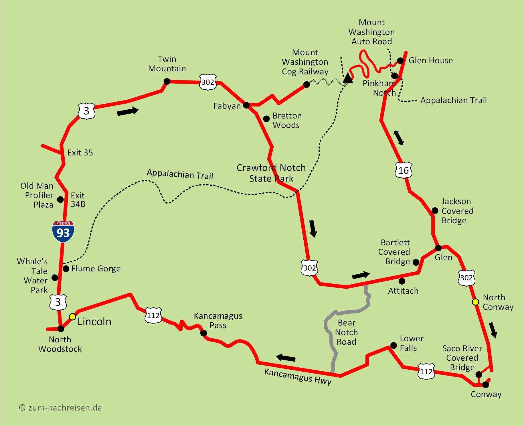 Lincoln → 10 Meilen → Old Man Of The Mountain Historic Site → 23 Meilen → Cog Railway Base Station (Zahnradbahn auf den Mt. Washington) → 8 Meilen → Mount Washington Hotel (Bretton Woods) → 40 Meilen → Glen House → 8 Meilen → Mt.-Washington-Gipfel via Auto Road → 8 Meilen → Glen House → 3 Meilen → AMC Joe Dodge Lodge (Pinkham Notch)