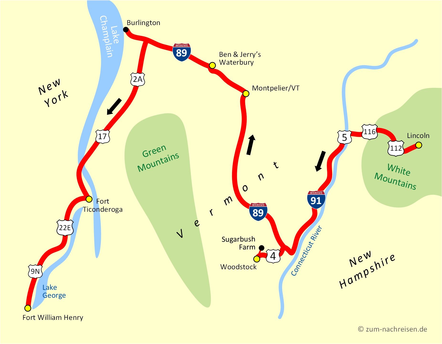 Schließlich verabschiedest du dich von den White Mountains nach Westen. Nach etwa 30 Meilen überquerst du den Connecticut River, der hier die Grenze zwischen den Staaten New Hampshire und Vermont bildet.