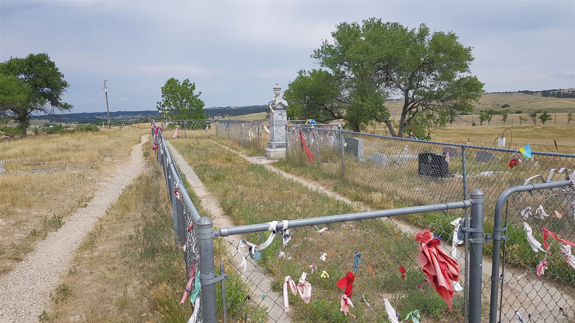 Ich hatte erwartet, ein Visitor Center mit Denkmal und Informationen vorzufinden. Stattdessen traf ich auf einen Ort, der völlig verwahrlost ist und sich der Erinnerung an die Opfer in keiner Weise würdig erweist. Das offenbar einmal vorhandene Besucherzentrum ist verfallen. Am Straßenrand wurde lieblos Indianerschmuck angeboten. Auf der kleinen Anhöhe gegenüber der Gedenkschilder mit Informationen am Straßenrand liegt der Friedhof mit einigen Opfern des Massakers, aber auch erst später verstorbenen Zeitzeugen. Jugendliche und Kinder mit Fahrrädern, zweifellos nativer Abstammung, lungerten um den Friedhof herum und bettelten. Eine traurige Darbietung. Wenn wenigstens die Gräber, die ein einfacher Maschendrahtzaun umgibt, gepflegt wären! Nun ja, jetzt habe ich ein Bild vom Wounded Knee und weiß, wo das Massaker stattfand. Immerhin erlaubte mir ein Polizist, ein Foto seines Wagens von der „Oglala Lakota Nation Police“ zu machen. Aber es ist zweifellos eine extrem arme Region. Es fehlt m.E. aber auch am Geschäftssinn und vielleicht auch am Willen. Denn das Wounded Knee Massaker ließe sich m.E. gewinnbringend und gut vermarkten. Auch der Hauptort Pine Ridge, der kurz darauf passiert wird, macht keinen guten Eindruck.