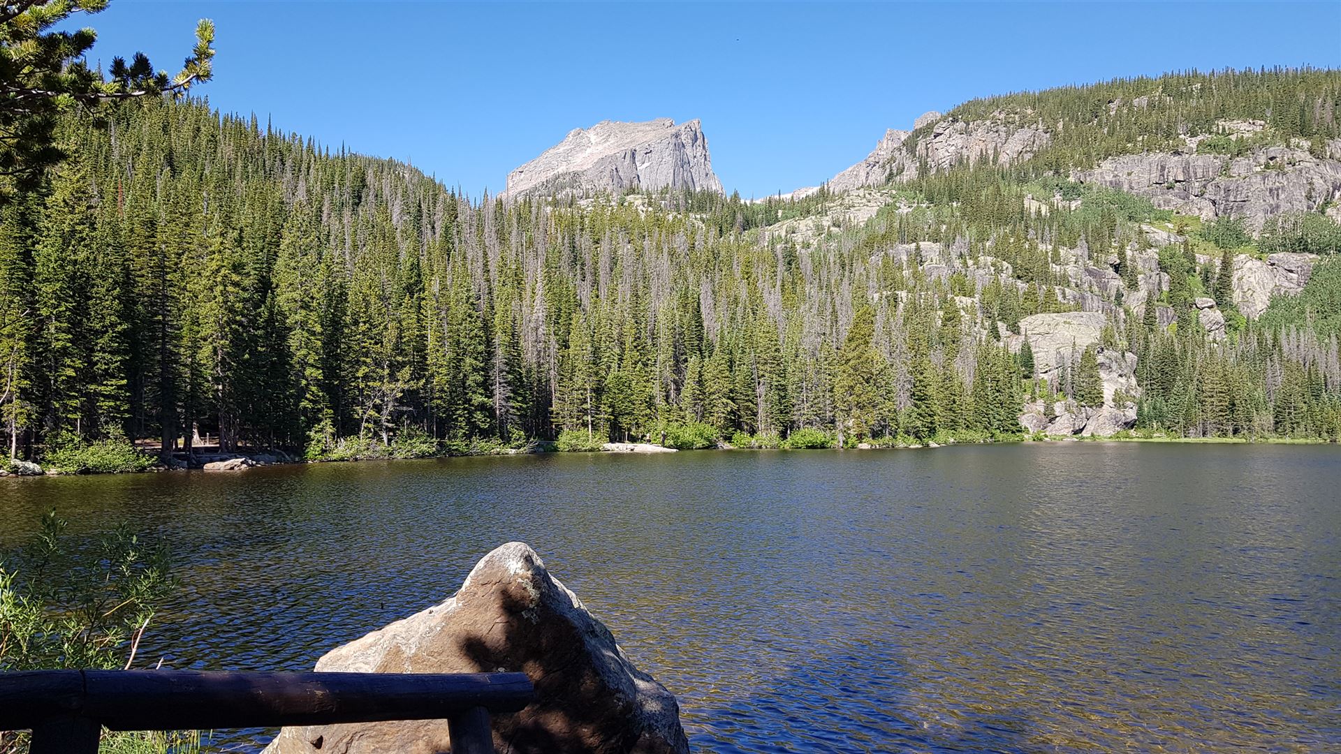 Die Bear Lake Region ist das Herzstück des Rocky Mountain National Park. Deshalb benötigt man auch ein besonderes Permit. Am besten, man fährt mit dem Auto auf den großen Park&Ride-Parkplatz und von dort mit dem Shuttle-Bus zum Bear Lake. Dabei ist es fast unvermeidlich, dass Wildtiere die Straße kreuzen. Vom Bear Lake führen viele Wanderwege weg. Jeder kann sich eine Wanderung nach seinen Ansprüchen aussuchen. Ich bin einen Tag lang sämtliche Seen abgelaufen (Bear Lake, Nymph Lake, Dream Lake, Emerald Lake, Lake Haiyaha, The Loch, Mills Lake, Alberta Falls). Jeder See fasziniert durch eine andere Färbung. Zum Teil war etwas Kraxelei erforderlich. Die Nadelbäume der Rockies geben dem Park eine besondere Note. Von höheren Standorten aus war der Longs Peak zu sehen, der höchste Berg des Rocky Mountain National Park.