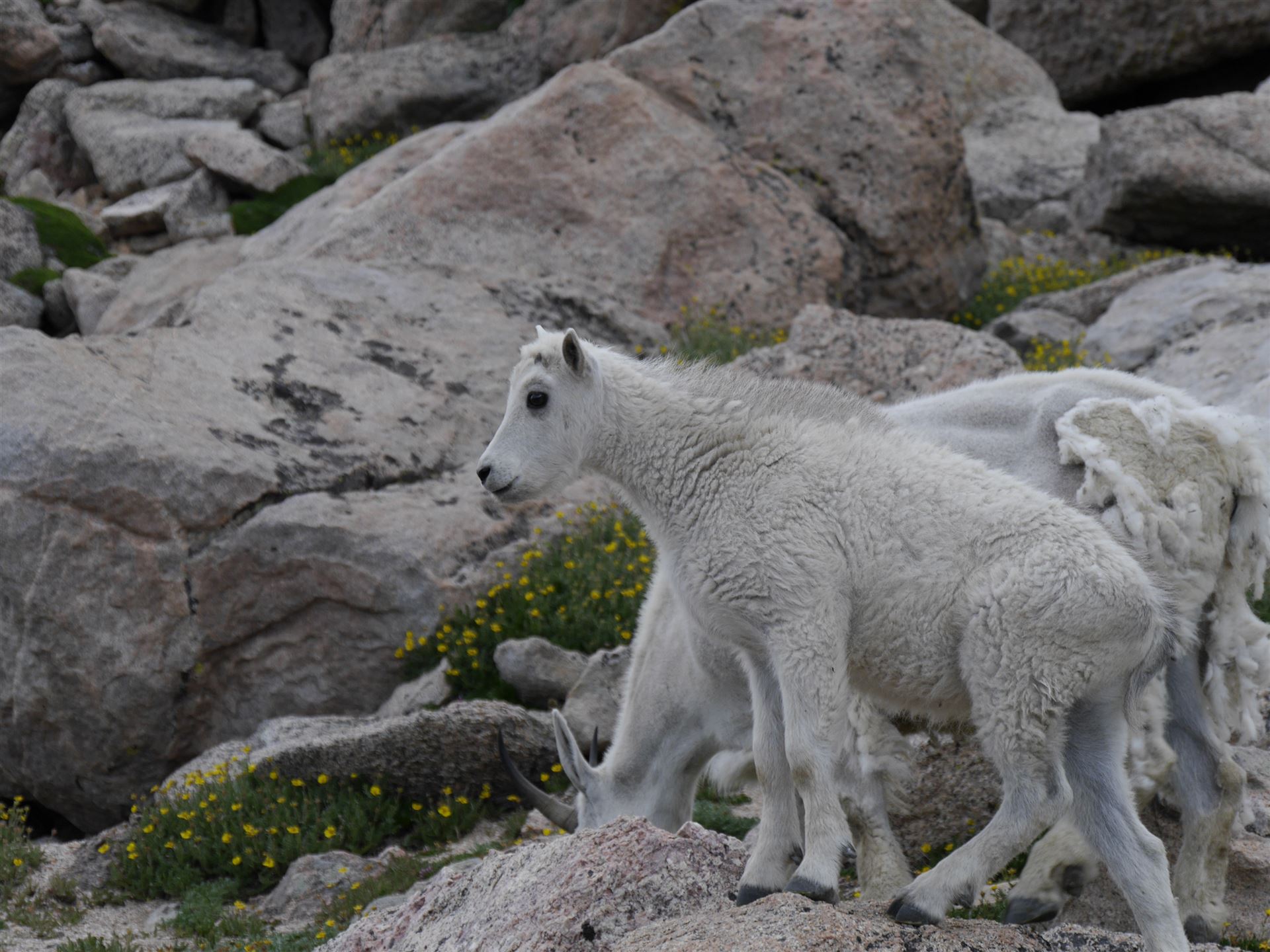 Von der Mautstelle (15 Dollar) bis zum Gipfelplateau des Mt. Evans sind es 14 Meilen bzw. 22,5 Kilometer. Unterwegs entdeckst du weiße Bergziegen und andere Bergbewohner. Teilweise hat die durchgehend geteerte Straße unter den Witterungsverhältnissen im Hochgebirge erheblich gelitten. Aber du wirst ohnehin nicht schnell fahren. Auf dem Gipfelplateau ist ein großer Parkplatz und bis zum höchsten Punkt ist etwas Kraxeln angesagt. Gegenüber entdeckst du Mt. Bierstadt.