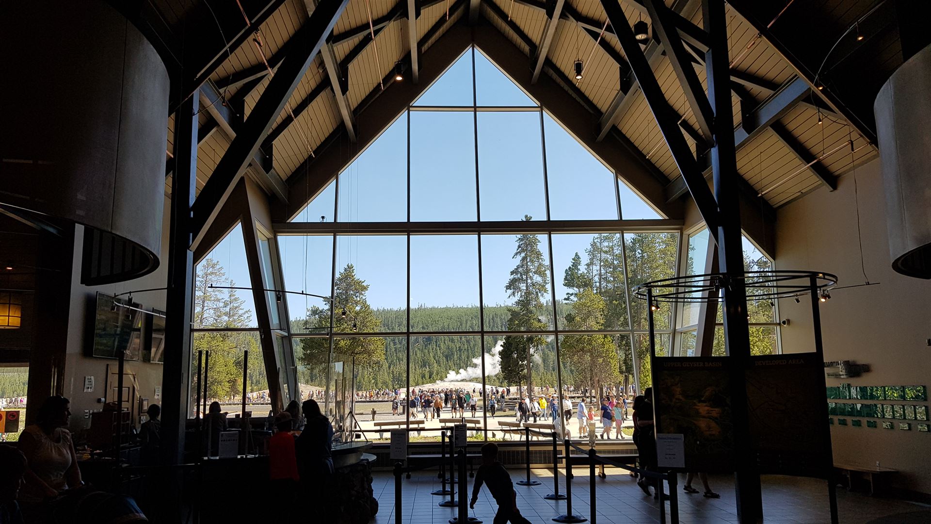 Du gehst in das Visitor Center und besorgst dir einen Umgebungsplan. In der Halle steht ein Schild mit der Uhrzeit, wann Old Faithful das nächste Mal ausbrechen wird. Das ist ca. alle 90 Minuten der Fall. Die Zeit ist auf +/- 10 Minuten genau, daher hat der berühmte Geysir schließlich seinen Namen, der „Alte Getreue“. Durch die große Glaswand erspähst du bereits den kleinen Hügel des Old Faithful und du verlässt das Gebäude auf der Rückseite. Wenn noch viel Zeit bis zum nächsten Ausbruch ist, kannst du dich gleich auf den Weg durch das Geysir-Feld machen und den Ausbruch von Old Faithful auf dem Rückweg bewundern. So sparst du Zeit.