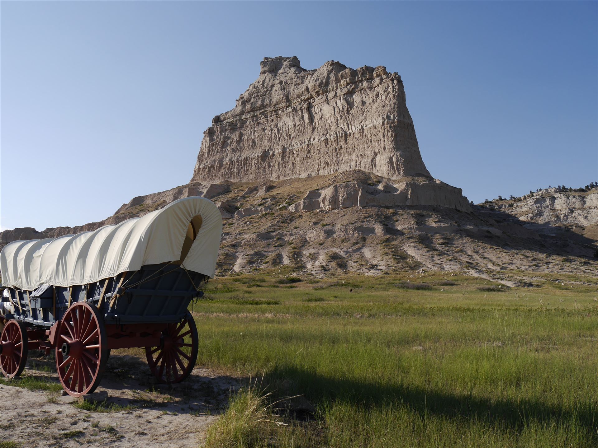 Vom Hotel in Scottsbluff fährst du zum Visitor Center. Das Scotts Bluff National Monument schützt ein bergiges Areal, das die Prärie am North Platte River überragt. Hier kamen seinerzeit viele Siedler auf ihrem Weg nach Westen durch (Oregon Trail, California Trail). Die Siedler wussten, dass sie die Prärie jetzt hinter sich lassen und „langsam“ in bergigeres Gelände Richtung Rocky Mountains gelangen. Da es mit den Planwagen schwierig war, die weichen Böden entlang des North Platte River zu befahren, mussten die Siedler hier über den Pass am heutigen Scotts Bluff National Monument fahren. Die durch ständige Abnutzung in den Fels eingefrästen Wagenspuren sind zum Teil noch heute erkennbar. Vom Visitor Center kannst du einem Trail ein Stück folgen. Ausgangspunkt sind die Planwagen mit künstlichen Zugtieren.