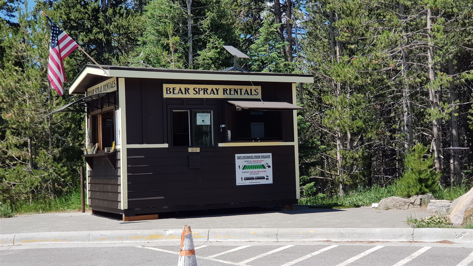 Schließlich fährst du zum Canyon Village. Wenn du morgen früh die von mir empfohlene Wanderung auf den Observation Peak unternehmen möchtest (ca. 5 Stunden hin und zurück), empfehle ich, heute noch ein Bärenspray für morgen auszuleihen. Ein Kiosk von Bear Aware befindet sich an der Zufahrt zum Canyon Village Store. Und jeder wird aufgefordert, das Informationsvideo über das richtige Verhalten bei Bärenkontakt anzuschauen.