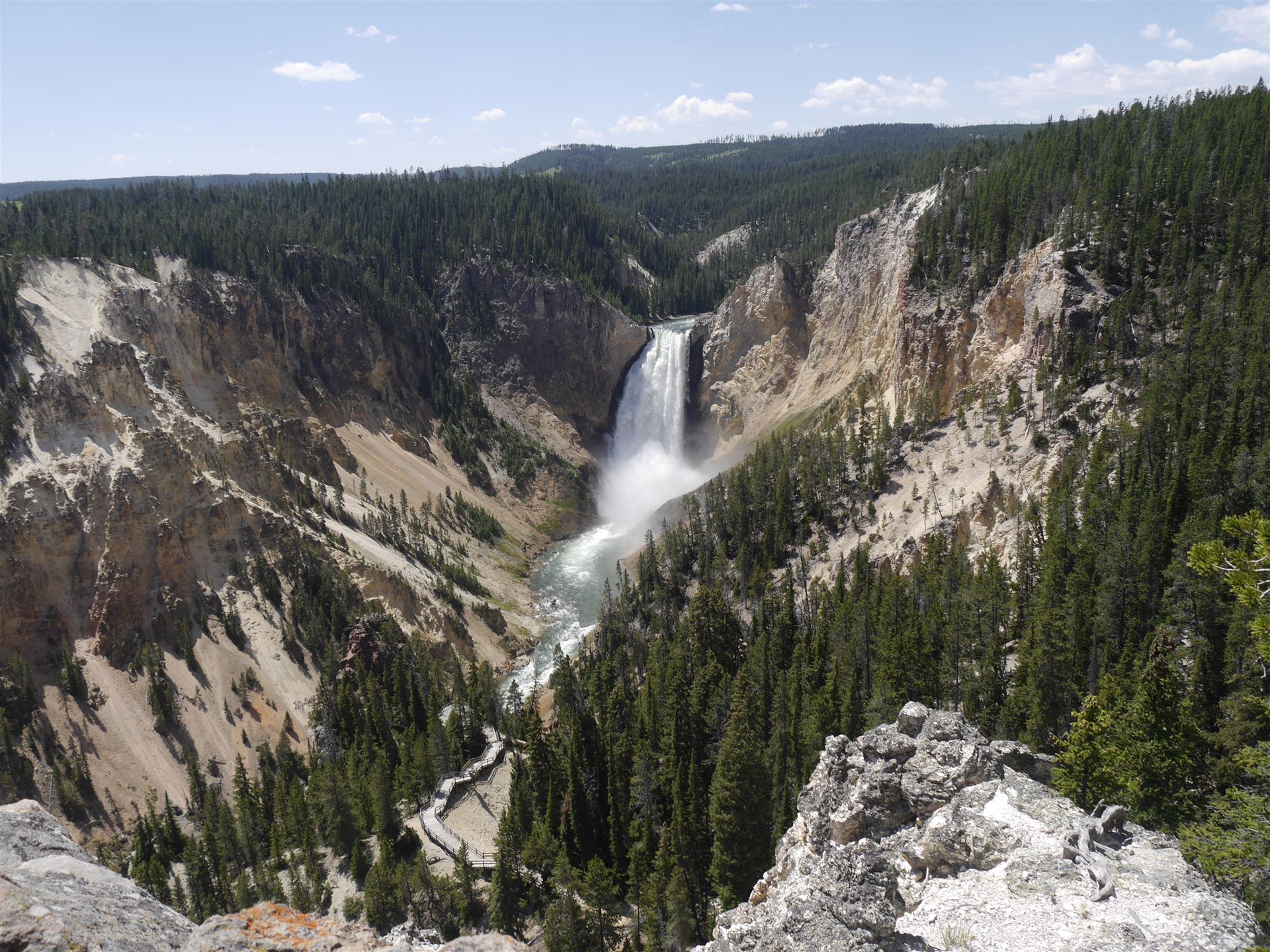 Bei Tower Junction zweigt der Highway 212 ins Lamar Valley und zum Nordost-Eingang ab. Dafür fehlt jedoch die Zeit. Du bleibst auf dem Grand Loop nach Süden. Du passierst deinen späteren Übernachtungsort Canyon Village und fährst zunächst geradeaus weiter zum Grand Canyon of the Yellowstone. Es gibt je einen Rim Drive im Süden und im Norden des Grand Canyon of the Yellowstone. Am besten, du fährst bis zur Abzweigung des South Rim Drive und diesen einmal hin und zurück (Discovery Overlook, Upper Falls Viewpoint, Artist Point). Auf dem Rückweg zum Canyon Village fährst du dann den North Rim Drive von Süd nach Nord. Das ist nämlich eine Einbahnstraße. Die Aussichtspunkte werden dich begeistern (Brink of the Upper Falls, Brink of the Lower Falls, Lookout Point). Du kannst auch hinabsteigen bis in die Nähe des hohen Wasserfalls. Der Steg ist aber durchaus anstrengend, zumal es erst hinunter geht und auf dem Rückweg wieder hinauf.