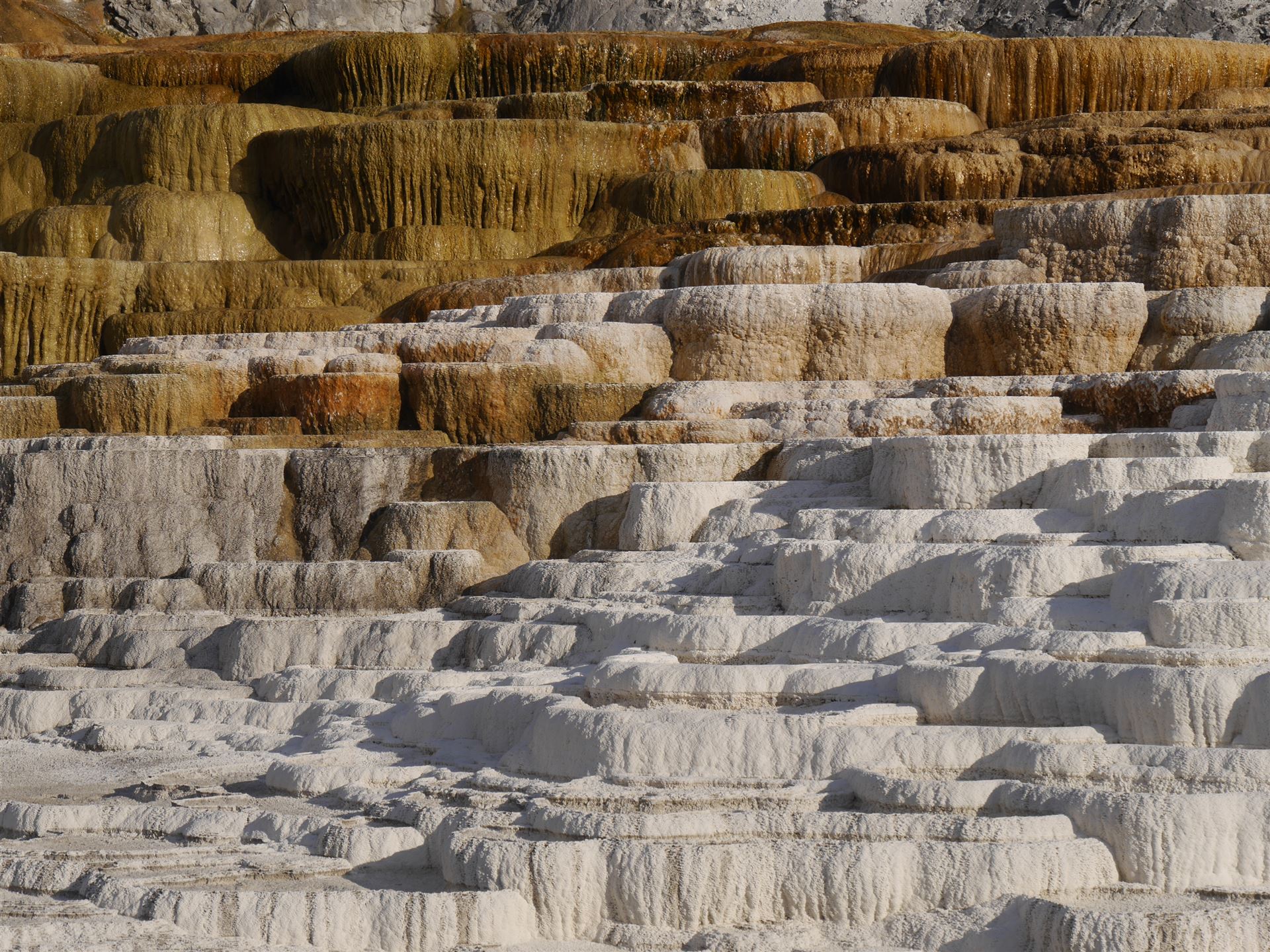 Ganz im Norden des Parks breiten sich die außergewöhnlichen Terrassen der Mammoth Hot Springs aus. Zunächst ist es möglich, auf dem Upper Terrace Loop Drive eine Runde mit dem Auto zu drehen. Zurück am Highway 89 geht es bergab zu den Parkplätzen bei den Lower Terraces. Von dort muss man bei einer Runde über die Terrassen gut zu Fuß sein. Aber es lohnt sich.