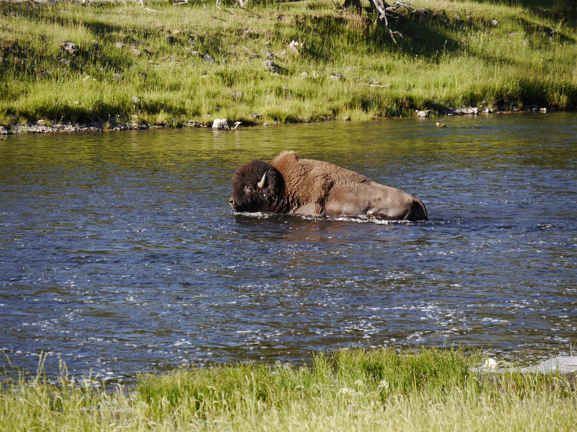 Schließlich fährst du den Grand Loop nach Osten. Beim Petrified Tree, also dem versteinerten Baum, lohnt sich ein kurzer Halt. Ich bin von dort (mit Bärenspray „bewaffnet“) bis kurz vor den Lost Lake und den gleichen Weg zurück gewandert. Dabei musste ich mich an Bären vorbeischleichen, die sich in einiger Entfernung im hohen Gras aufhielten.