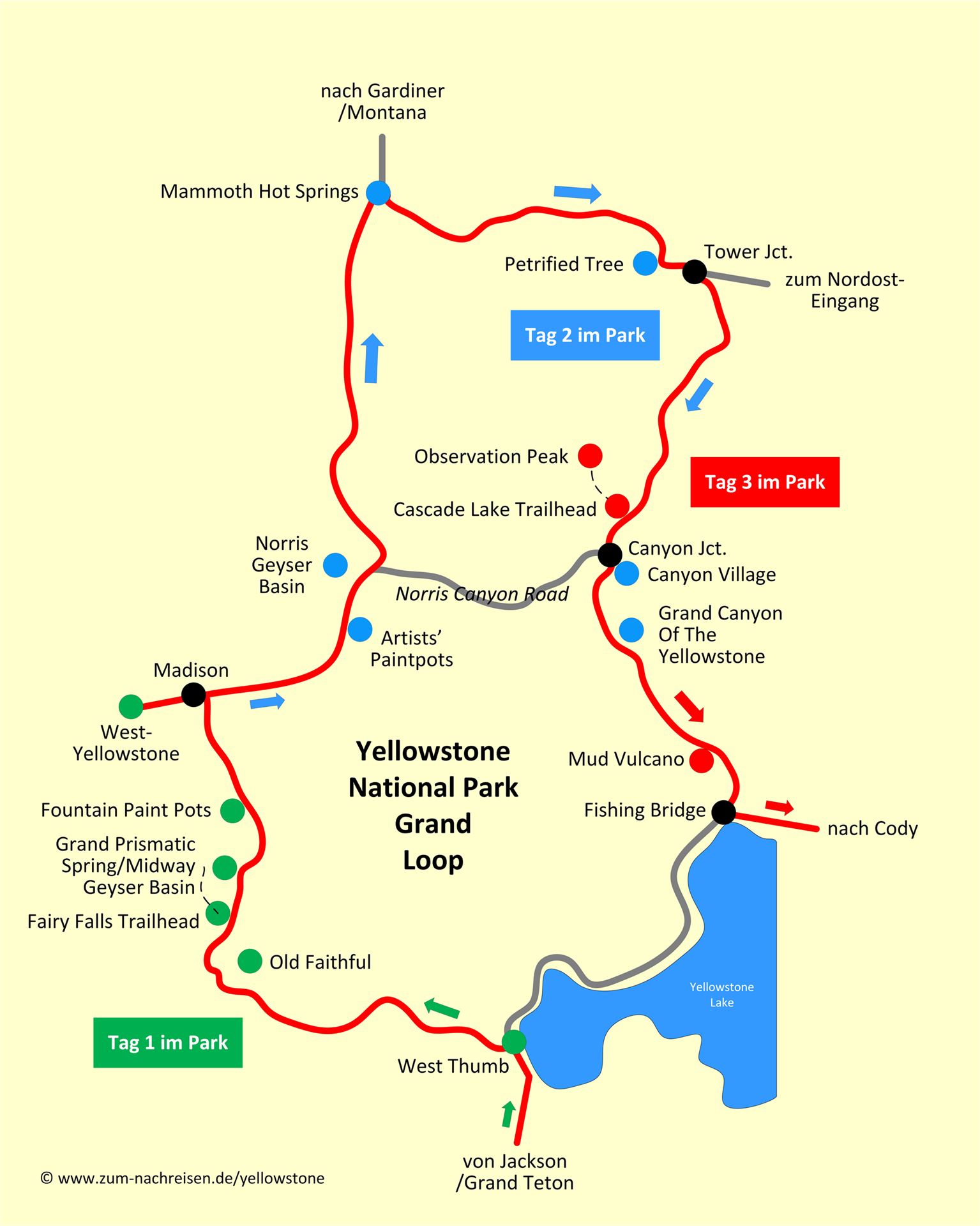 Nach dem Frühstück fährst du wieder in den Yellowstone NP zurück und erreichst den Park über den Westeingang (West Entrance). An der Kreuzung Madison wechselst du auf den Highway 89 nach Norden. Bei den Artists’ Paintpots hältst Du zum ersten Mal. Beim riesigen Norris Geyser Basin verbringst du mehr Zeit, denn die Wege sind lang. Aber bedenke, dass der Yellowstone NP riesig ist und es liegt noch viel Sehenswertes vor dir.