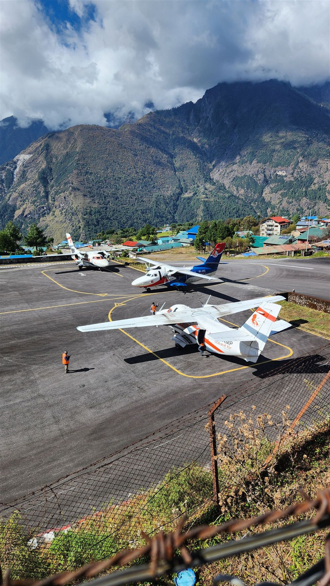 In die kleinen Flugzeuge von Ramechap nach Lukla passten maximal 18 Personen. Die Flieger machten auf mich einen guten Eindruck, außerdem möchten sowohl die Piloten, als auch die einzige Flugbegleiterin, wieder zu ihren Familien nach Hause kommen. Natürlich hat die Start- bzw. Landebahn am Tenzing-Hillary-Airport, wie der Flugplatz offiziell heißt, nur 527 Meter Länge und die um 12% geneigte Landebahn, die am Ende abrupt abbricht, ist spektakulär. Der Flug und die Landung waren jedoch ruhig und angenehm. Da habe ich viel schlechtere Erinnerungen an die Dominikanische Republik. Dort waren die Hitze und der Benzingestank im Regionalflieger unerträglich. Die Winde sollen am Flugplatz Lukla manchmal problematisch sein, aber bei schlechtem Wetter wird auch nicht geflogen. So kann es durchaus passieren, dass man zwei Tage warten muss, bis ein Flieger abhebt. Wenn alle Stricke reißen, muss man zwei Tage zu Fuß gehen und dann mit dem Auto zurück nach Kathmandu fahren, um den Flieger nach Deutschland nicht zu verpassen. Deshalb ist ein Zeitpuffer eingeplant. Der letzte größere Unfall am Flughafen Lukla geschah im April 2019, als ein Flieger von der Startbahn abkam und mit einem daneben abgestellten Hubschrauber kollidierte. 2008 starben dagegen 18 Menschen, als eine Maschine beim Landeanflug mit schlechter Sicht zu tief war und gegen den Berg prallte.