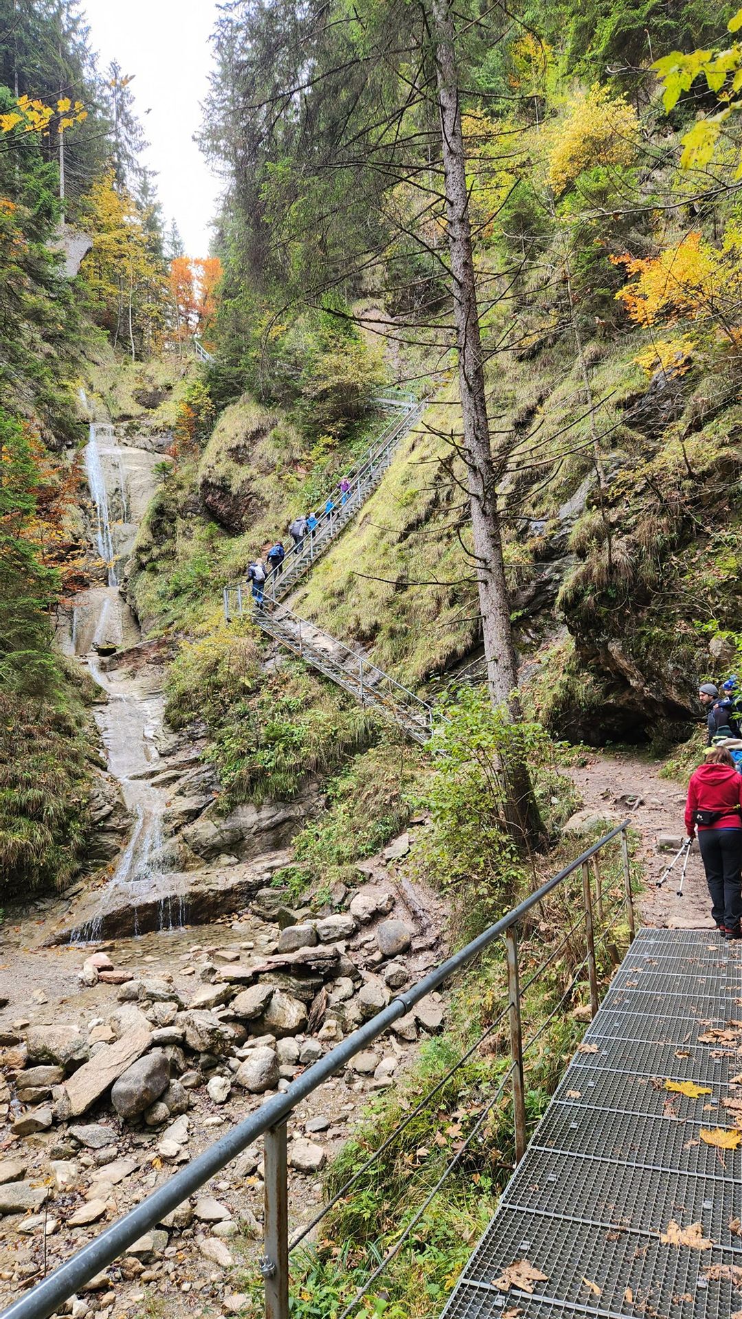 Los gehst am Parkplatz der Alpspitz-Bahn in Nesselwang auf 900 m Höhe. Von dort wählten wir den Wasserfallweg entlang des Schlossbächl. Um die Schlucht begehbar zu machen, wurden hunderte Treppenstufen installiert. Die Abzweigung zur Mittelstation ließen wir rechts liegen. Nach der Querung des Forstwegs folgten wir dem Wurzelsteig bis zur Bergstation der Alpspitz-Bahn.