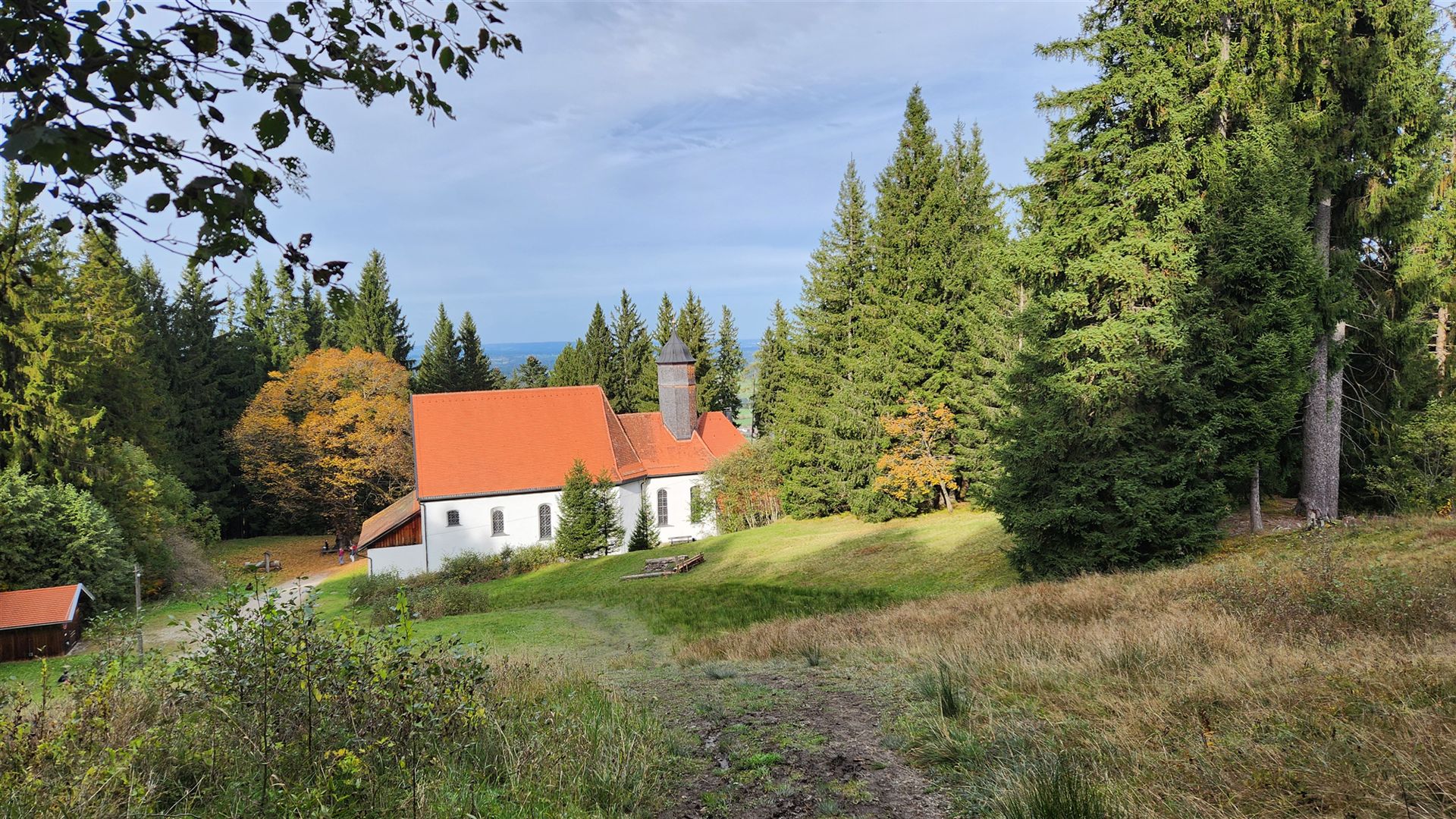 Zurück an der Bergstation gönnte ich mir eine schnelle Buttermilch an der Hänsel & Gretel-Hütte. Für den weiteren Rückweg wählten wir zunächst den Forstweg zur Kappeler Alp auf 1350 m Höhe. Dort sitzt man etwas ruhiger als rund um die Bergstation. Nachher ist man immer schlauer. Der Steig hinunter zur Wallfahrtskirche Maria Trost war dann nicht ohne. Es war leicht rutschig. Bei größerer Nässe kann so ein Steig durchaus zu einer Herausforderung werden. Schließlich erreichten wir den Kreuzungspunkt am Beginn des Kreuzwegs. Auf die 15 Minuten Aufstieg zur Ruine Nesselburg hatte ich dann keine Lust mehr. Viel steht davon eh nicht mehr.