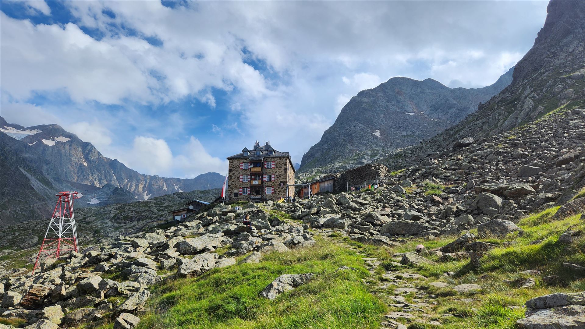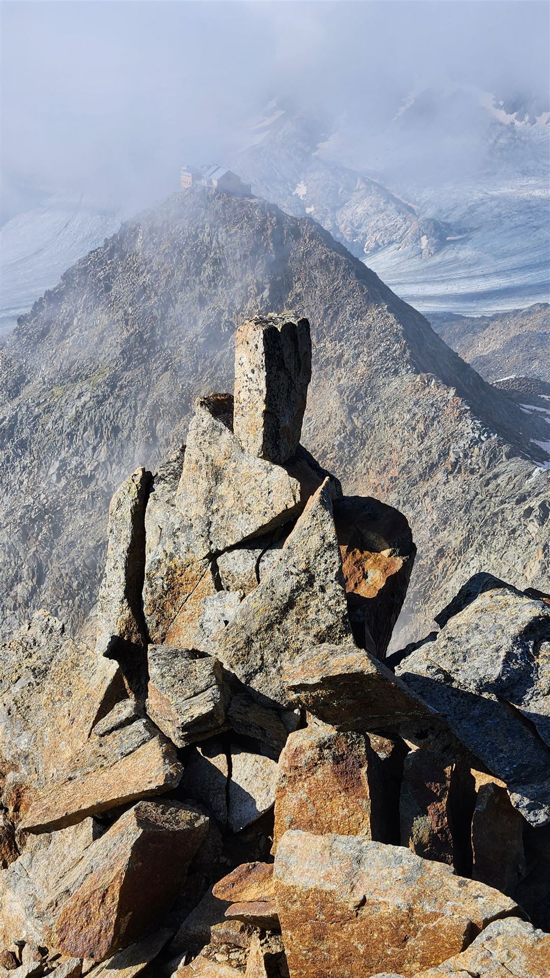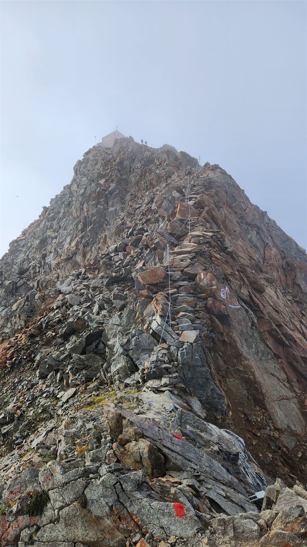 Das Becherhaus ist ein Erlebnis für sich. Die Hütte liegt eindrucksvoll auf einem exponierten Hügel, dem Becher. Vom Signalgipfel führt der Grat hinunter. Nur an einer Stelle ist der Grat etwas brenzlig. Dort hätte ich mir eine Seilversicherung gewünscht. Erwartungsgemäß ist das Becherhaus nur zu Fuß und mit dem Hubschrauber erreichbar. Das erschwert die Führung der Schutzhütte und schlägt sich auch im Preis für die einzige Dusche nieder: 10 Euro für 3 Minuten. Nicht bekannt ist mir, wie warm das Wasser wird. Ich habe mich fürs Wassersparen entschieden.