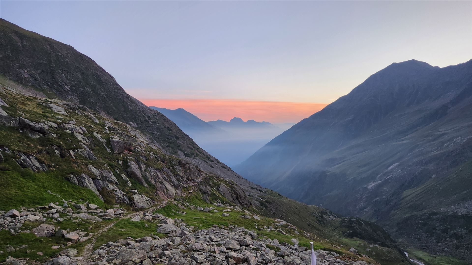 Bei den letzten Stufen zum Becherhaus fühlte es sich an, als würde ich einen Wallfahrtsort erreichen. Und tatsächlich: Hinter dem Hubschrauberlandeplatz fiel der erste Blick auf die Kapelle Maria im Schnee, die höchstgelegene Kirche Europas. Denn Maria im Schnee heißt zwar Kapelle, ist aber eine offizielle Kirche. Und wie es der Zufall wollte, lernte ich am Grat zum Becherhaus Harald kennen, seines Zeichens Priester aus Wien, und seinen Begleiter Markus, von Beruf Seelsorger. Nachdem wir uns auf der Terrasse des Becherhauses ausgeruht hatten, entschlossen sich die beiden spontan, vor dem Abendessen eine Heilige Messe abzuhalten. Die kleine Kirche war mit den anwesenden Bergsteigern schnell gefüllt. Besonders faszinierend fand ich, dass Harald die Messe zweisprachig in deutsch und italienisch abhielt. Wie sich herausstellte, studierte er seinerzeit Theologie in Rom und war somit des Italienischen mächtig. Den Papst hat er in dieser Zeit allerdings nicht getroffen. Ich unterhielt mich prächtig mit den beiden Wienern und wir blieben auch am Folgetag beim Abstieg ins Stubaital zusammen.