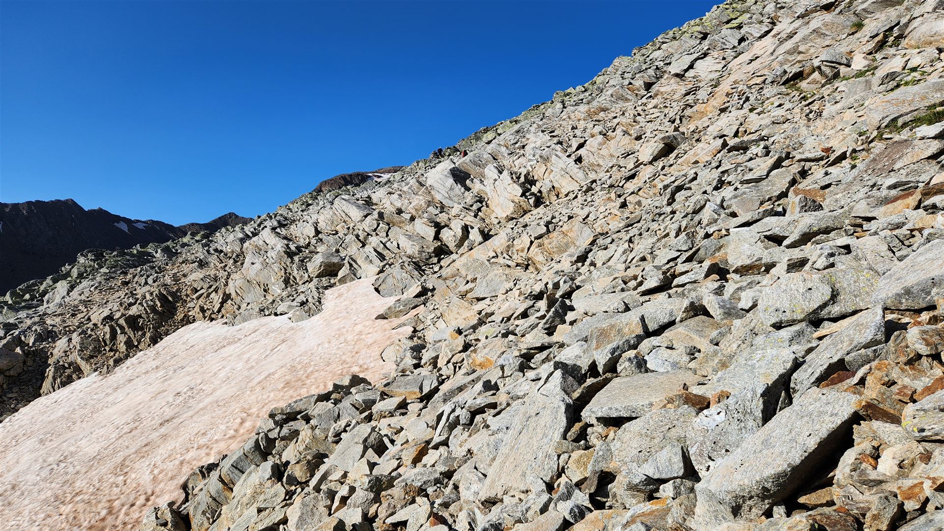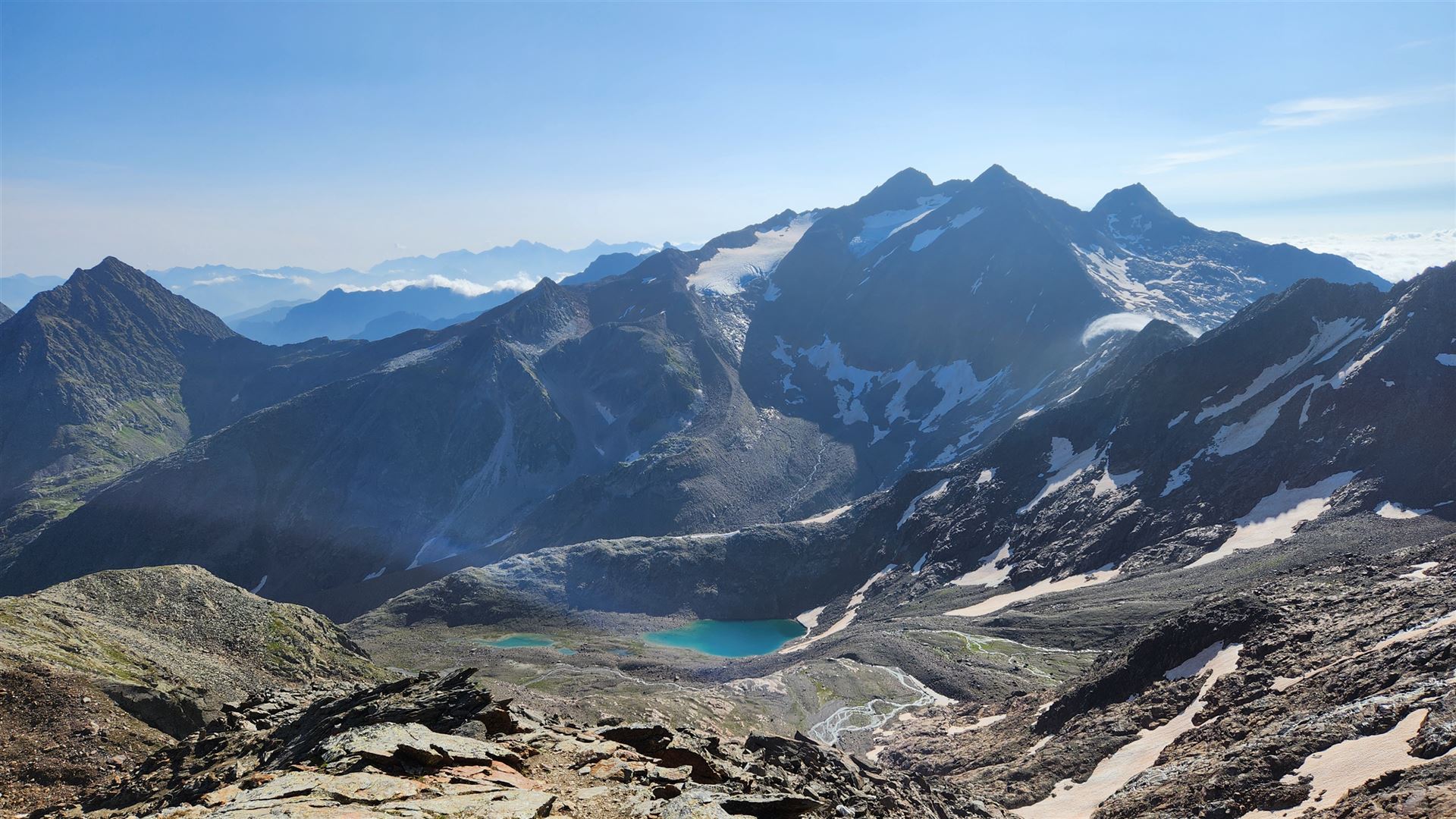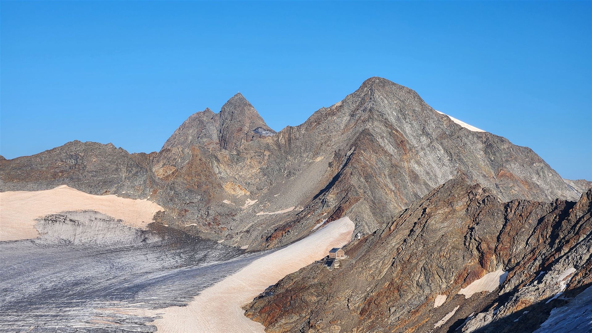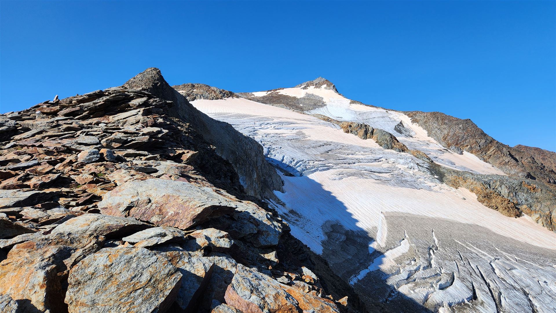 Vom Wilden Freiger kletterte ich über den Grat zum Becherhaus, der höchstgelegenen Hütte Südtirols, die ich letzte Woche von der gegenüberliegenden Müllerhütte aus sehen konnte. Der Blick auf die Karte machte deutlich: Becherhaus und Müllerhütte liegen als zentraler Knotenpunkt inmitten der Gletscherwelt. Hier laufen die Routen aus dem Stubaital, Ridnauntal, Pflerschtal und sogar dem Passeiertal und dem Ötztal zusammen. Das Ridnauntal ist in südöstlicher Richtung vom Becherhaus einsehbar.
