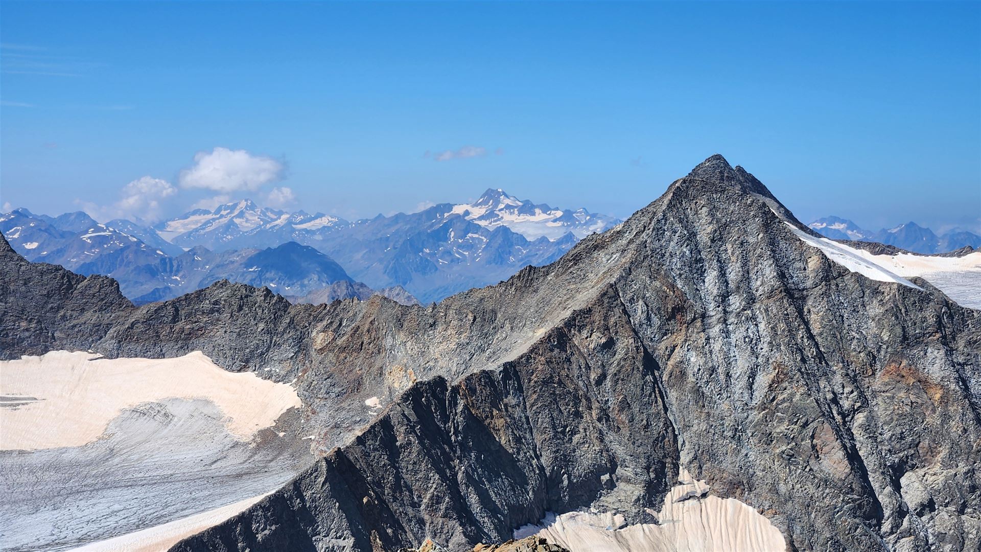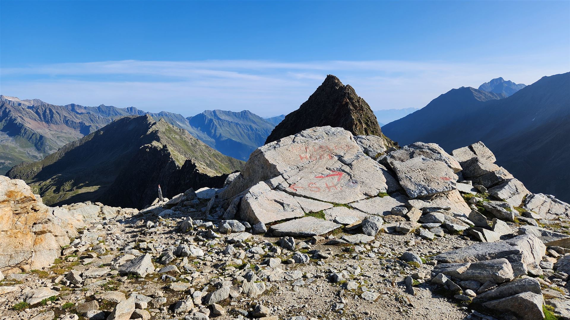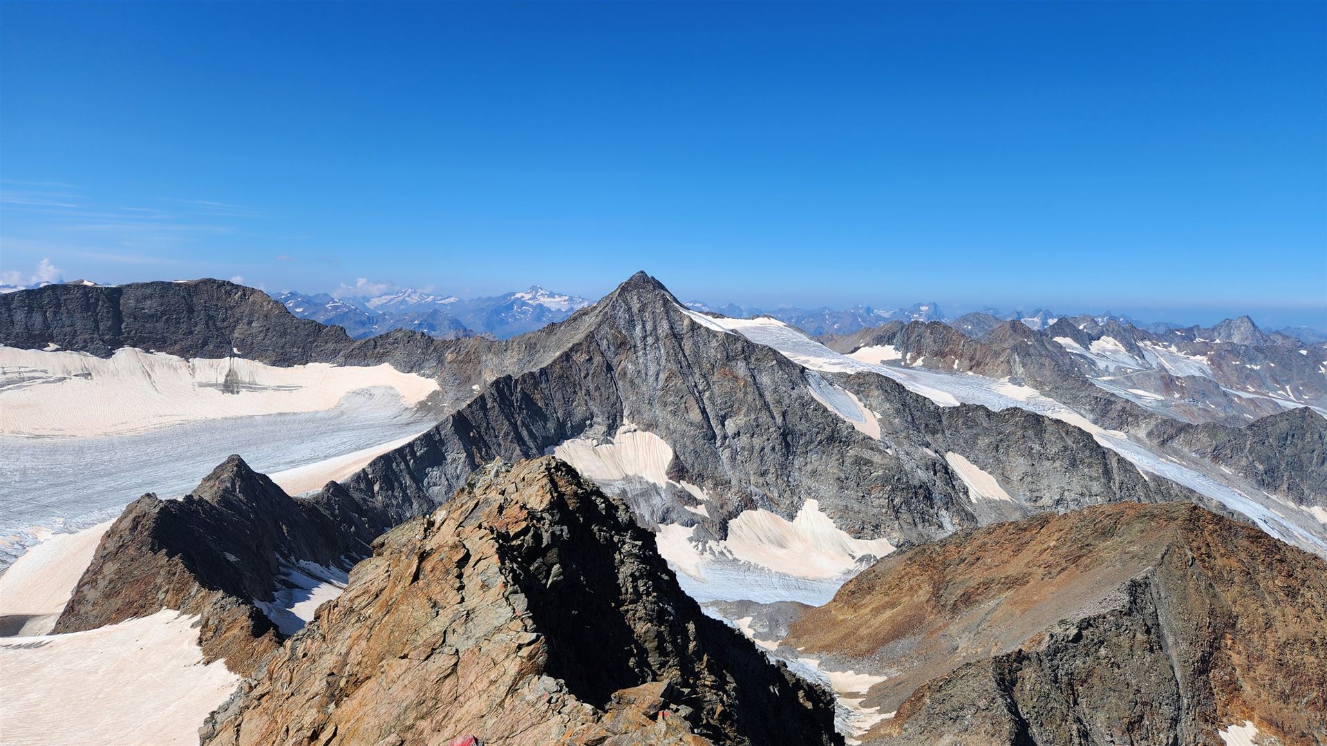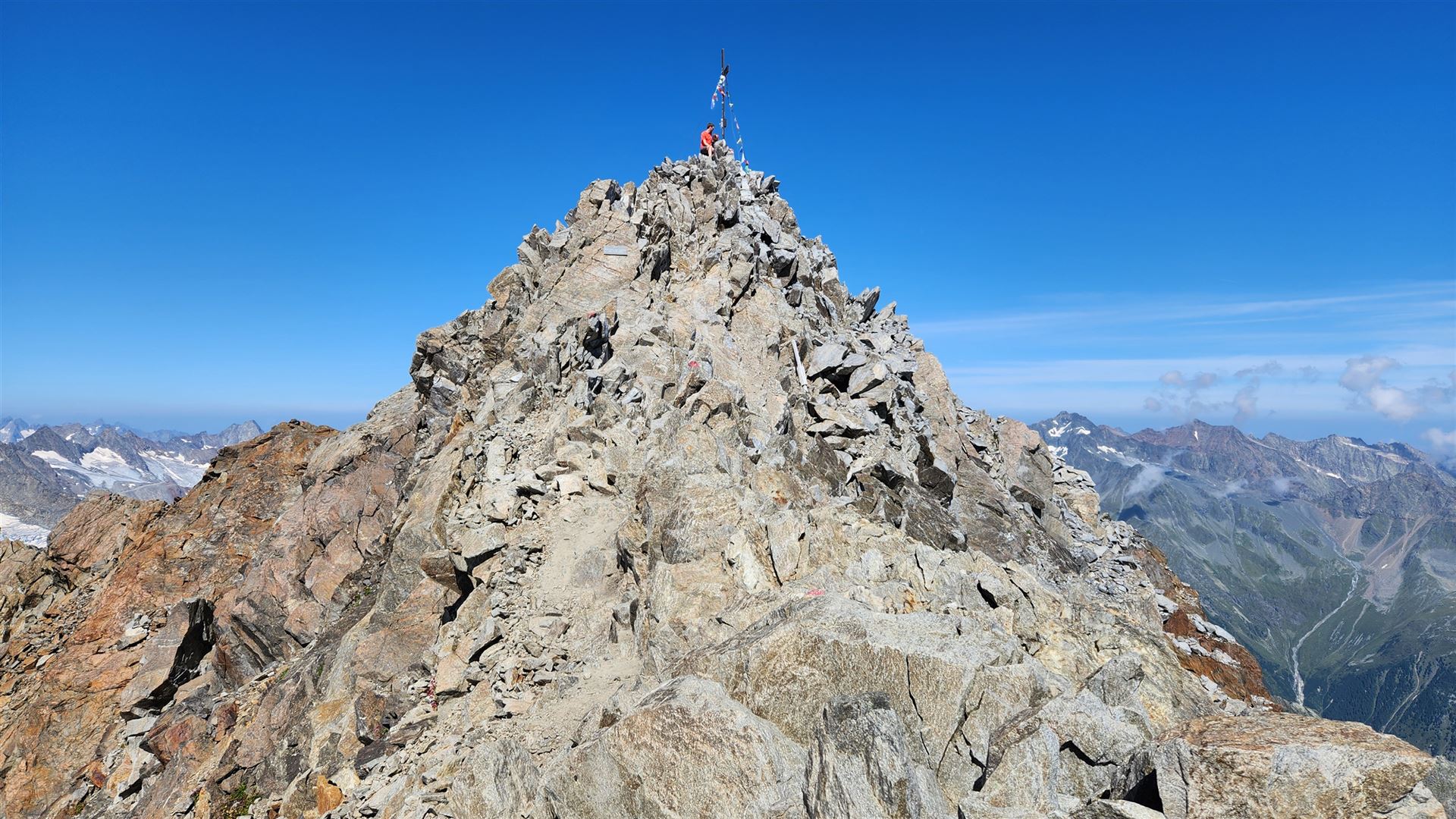 Mit leichterem Gepäck benötigte ich diesmal nur 2 Stunden vom Parkplatz bis zur Nürnberger Hütte. Am nächsten Tag erreichte ich nach ca. 3 ¾ Stunden den Gipfel des Wilden Freigers. Der Blick reichte bei blauem Himmel bis zur Weißkugel und zur Wildspitze im Westen. Im Osten war an diesem Tag der Habicht ganz nah. Im Norden sei die Ruderhofspitze (3474 m) erwähnt. Nur die Dolomiten im Süden waren wolkenverhangen.