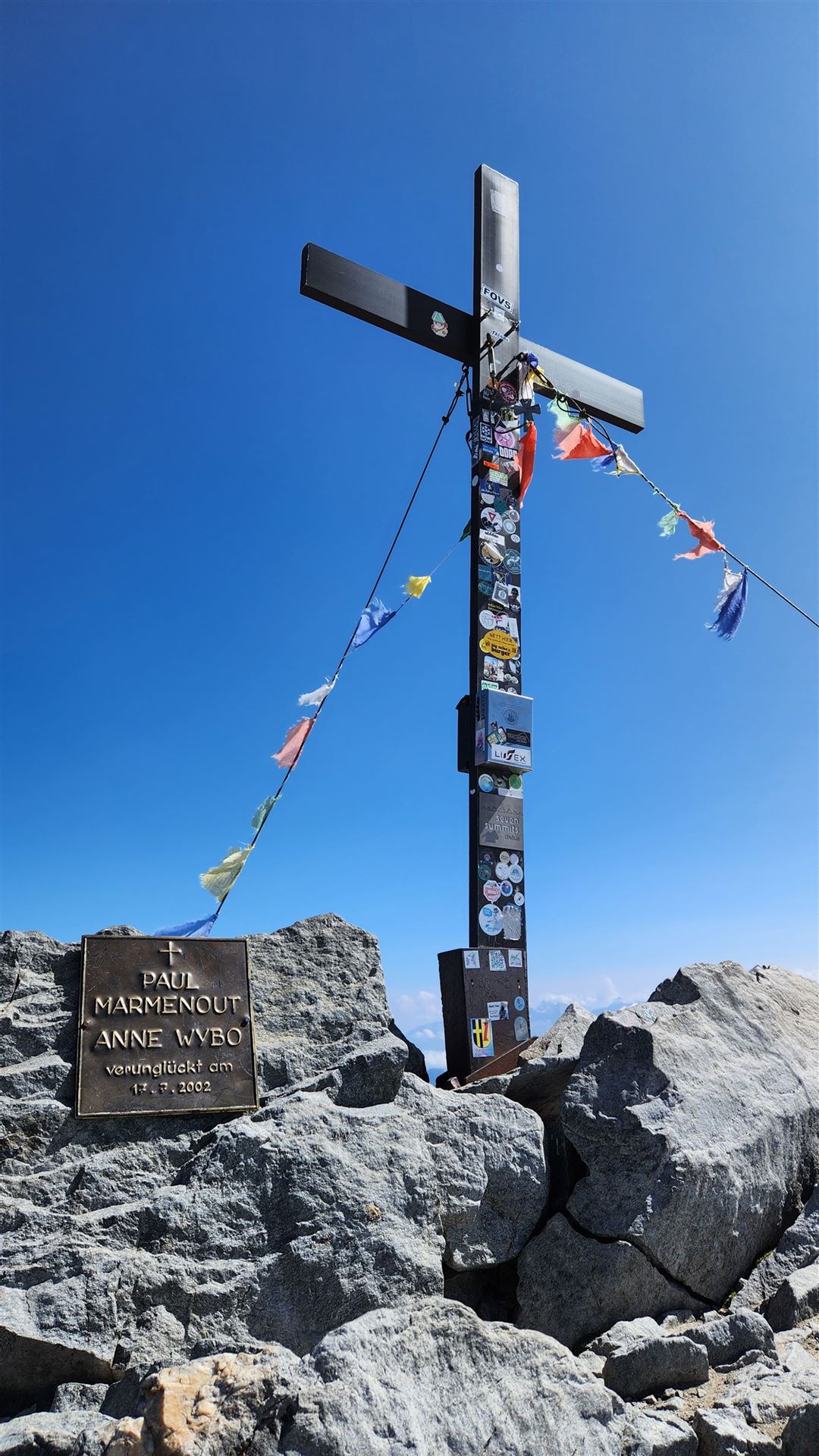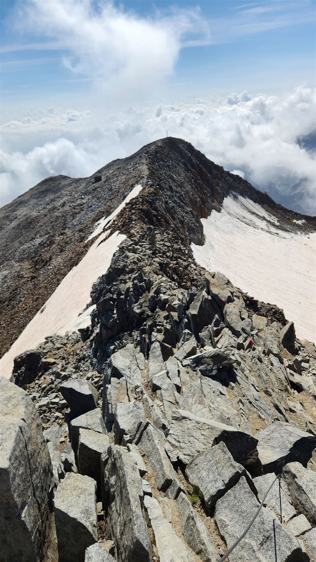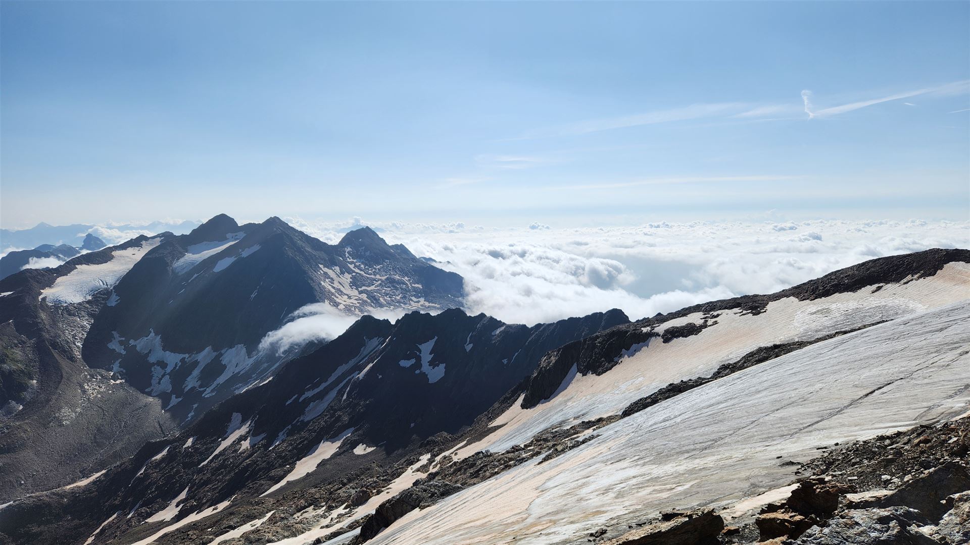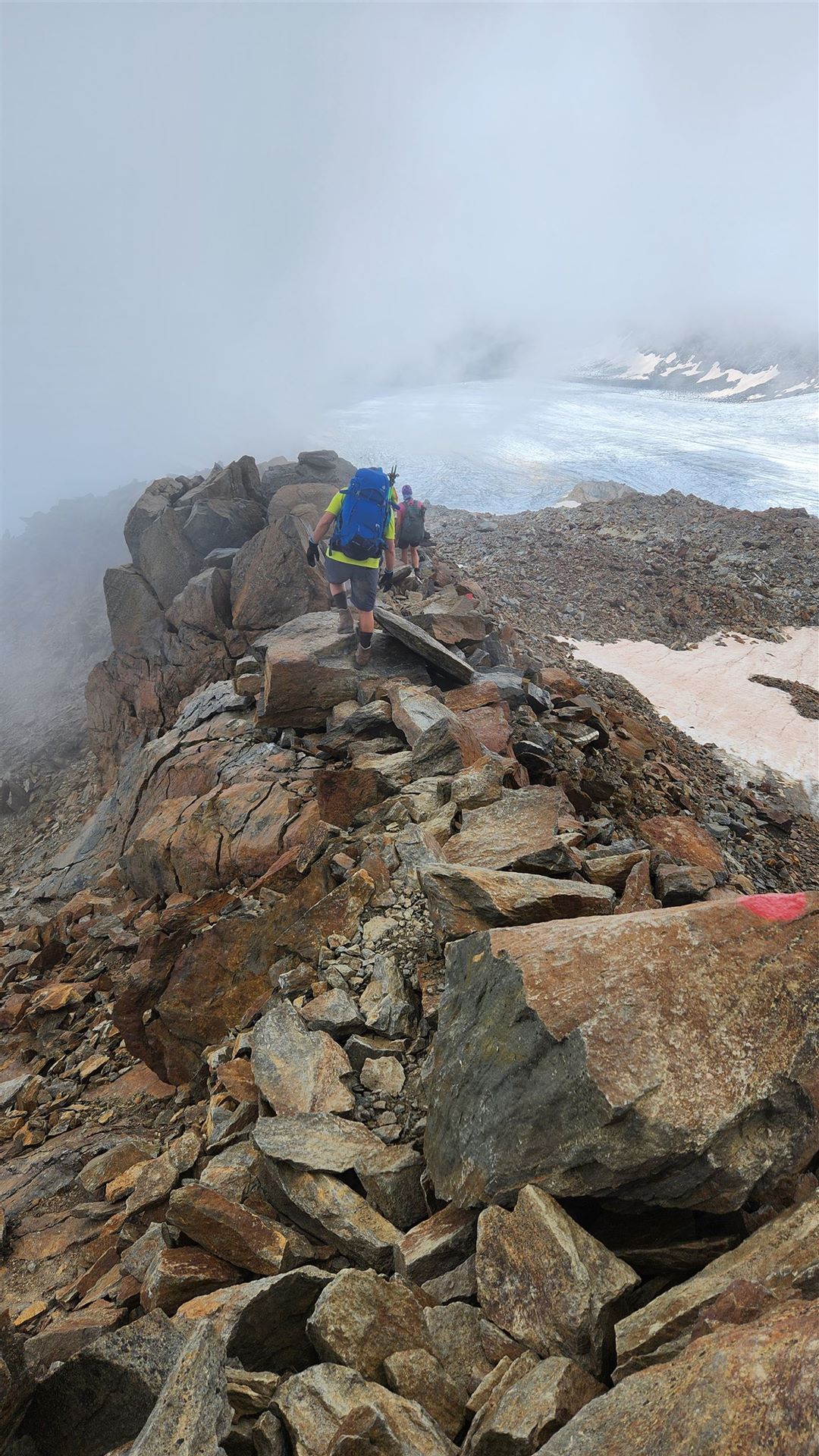 Auf den alternativen Abstieg zur Nürnberger Hütte über den Roten Grat haben wir verzichtet, denn dieser war von Wolken umhüllt. Außerdem gab es dort eine Woche vorher einen tödlichen Absturz, den wir in unseren Köpfen hatten.
